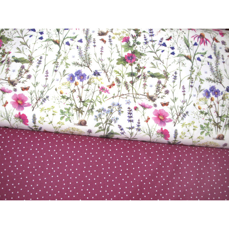 2 hochwertige Baumwollstoffe perfekt aufeinander abgestimmt. Verschiedene Blumen mit Schmetterlingen und Schnecken. Liebevoll und detailreich gezeichnet von Daniela Drescher. In Kombination mit einem Pünktchenstoff für vielerlei Nähprojekte geeignet. Besonders toll für den Sommer