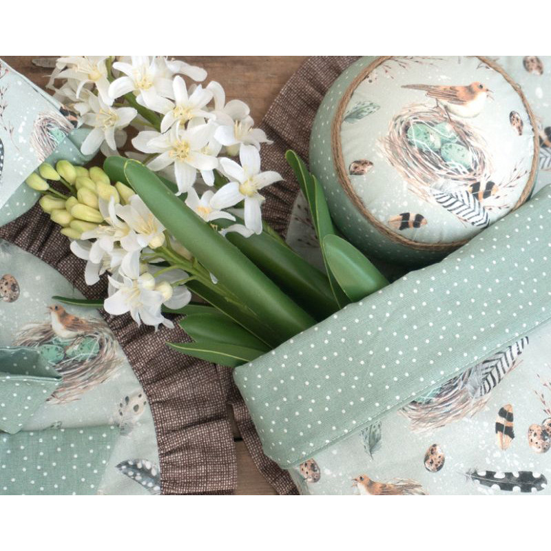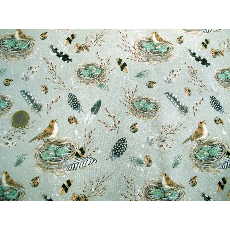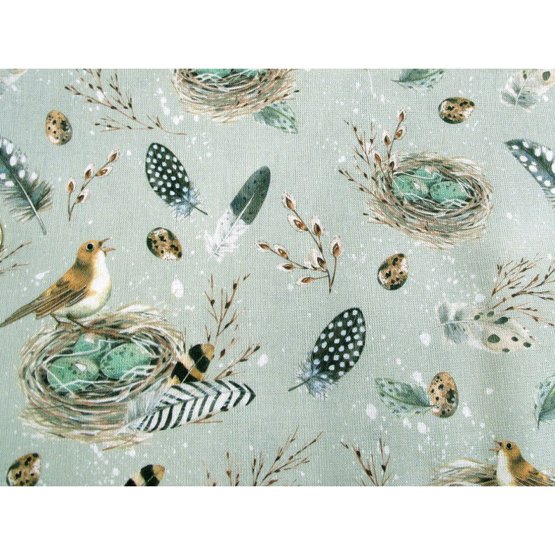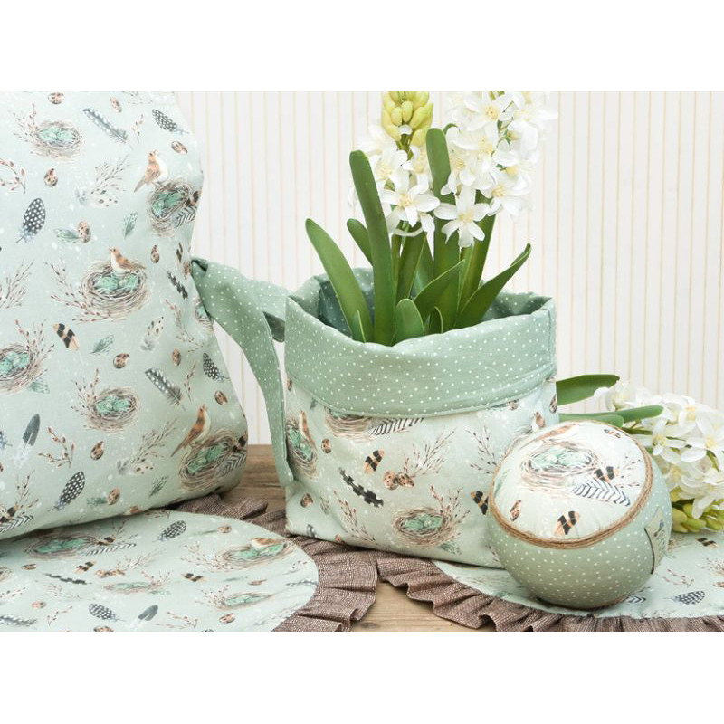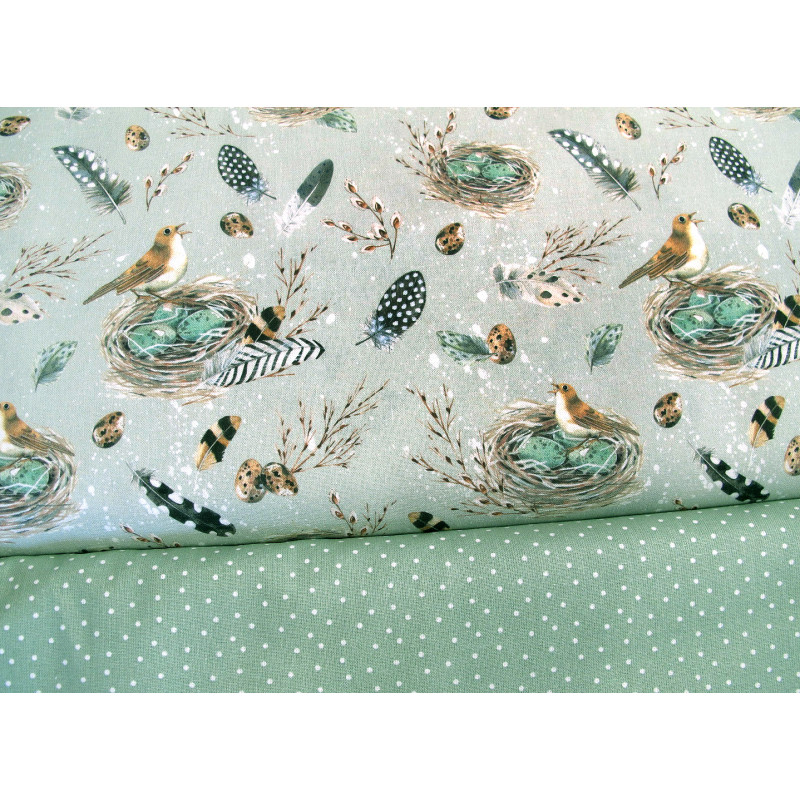2 hochwertige Baumwollstoffe perfekt aufeinander abgestimmt. Vögel im Nest dazu Federn und Vogeleier auf salbei. Liebevoll und detailreich gezeichnet von Kerstin Heß. In Kombination mit einem Pünktchenstoff in salbei für vielerlei Nähprojekte geeignet - ideal für Ostern/ den Frühling