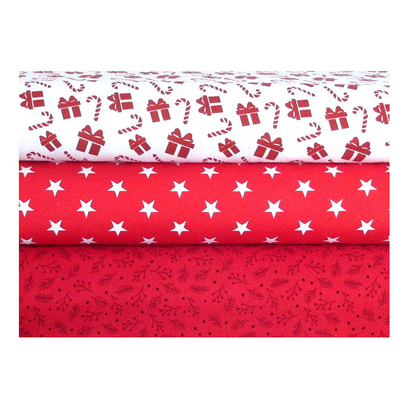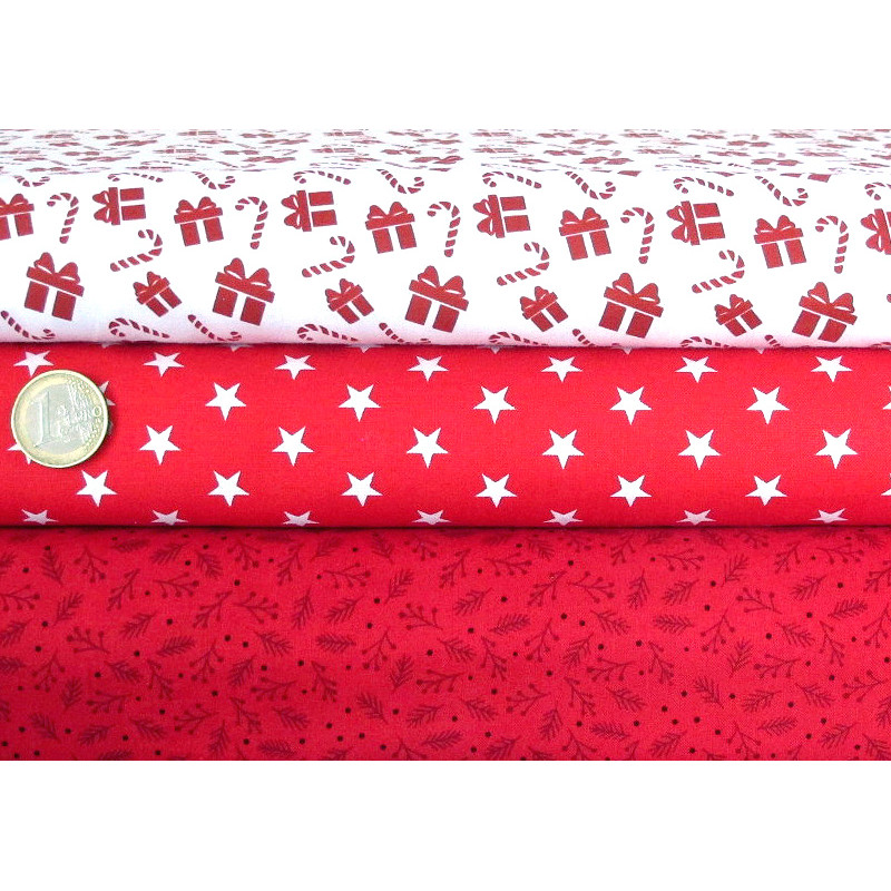 ein Stoffpaket mit weihnachtlichen Motiven bedruckt mit Sternchen, Zweigen, Geschenkpäckchen, Zuckerstangen in weiß rot - perfekt aufeinander abgestimmt -