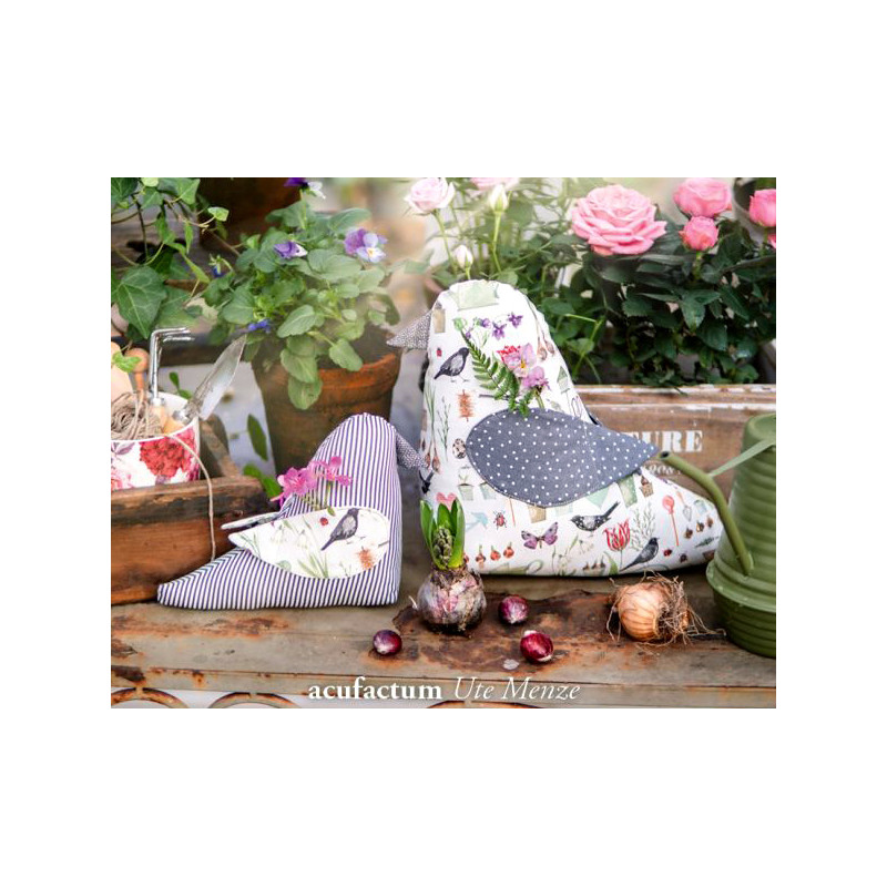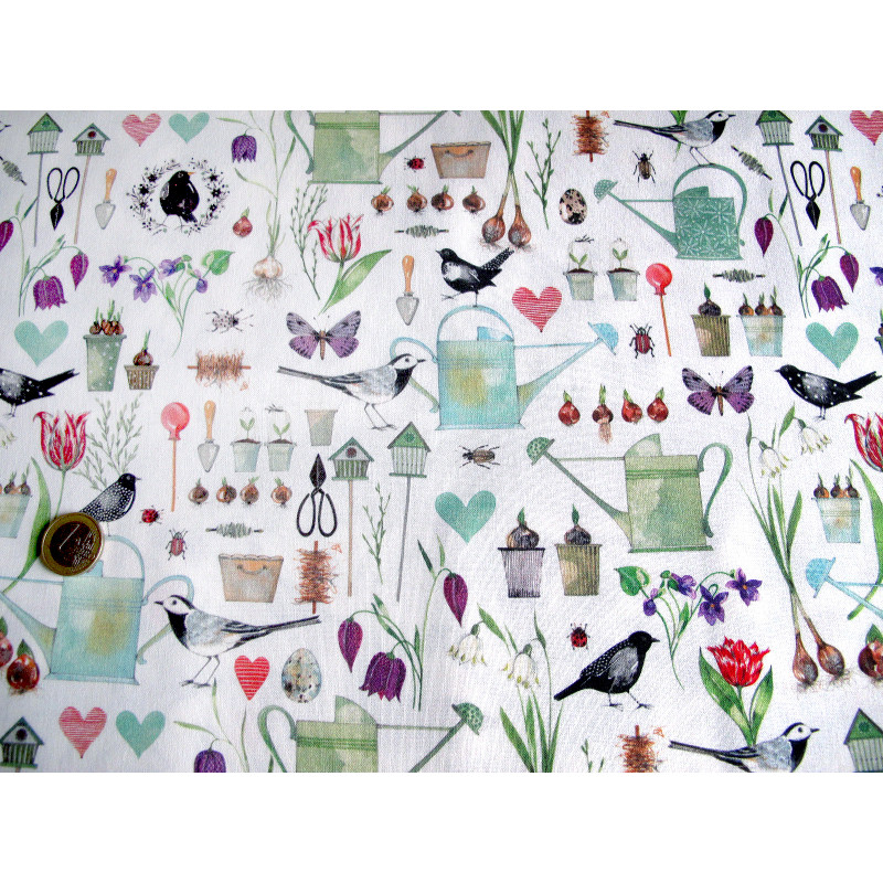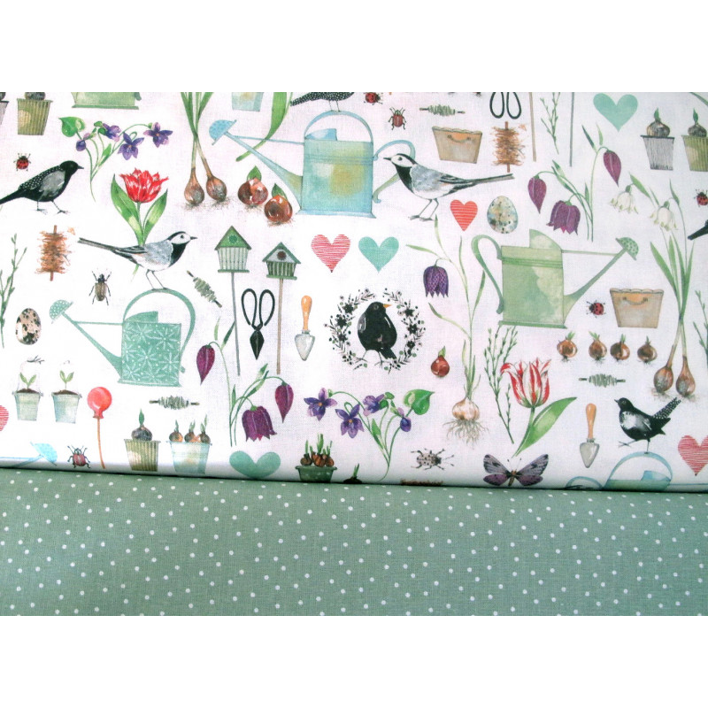 ein wunderschönes Stoffpaket mit 2 perfekt aufeinander abgestimmten Stoffen bedruckt mit Vögeln, Gießkannen, Blumen, Pünktchen. Beide Stoffe von acufactum