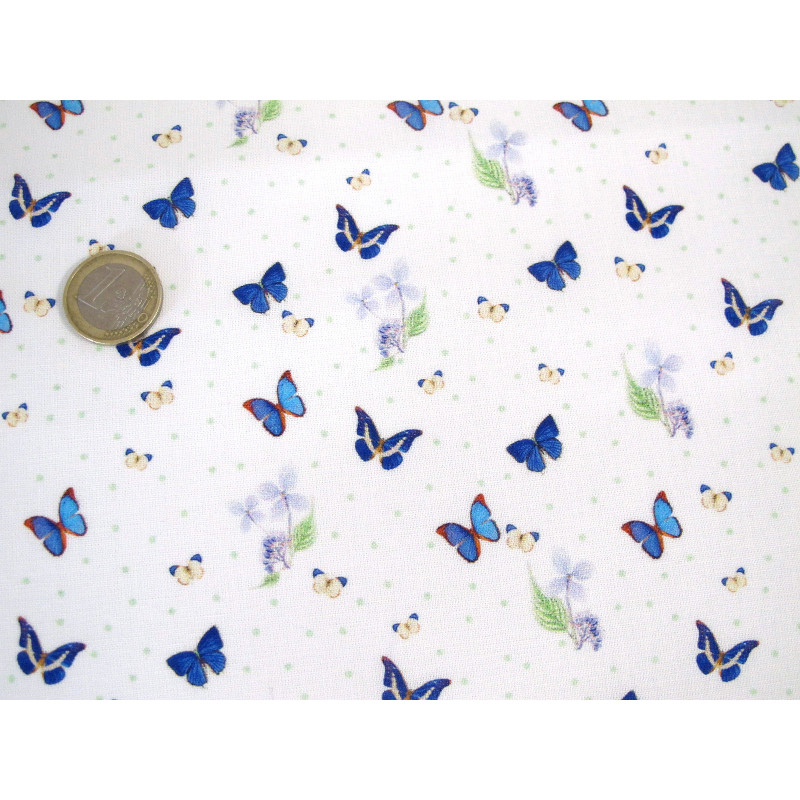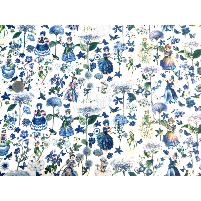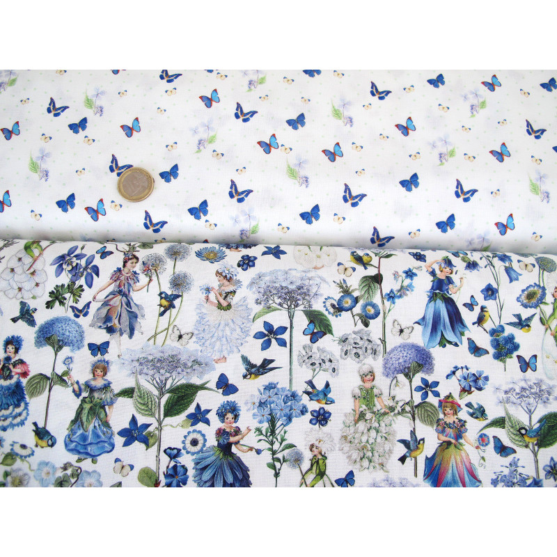 ein wunderschönes Stoffpaket mit Schmetterlingen, Blumen und Blumenmädchen in blau, grün, weiß, beide Stoffe aus der Serie Canterbury und zertifiziert nach Ökotex Standard 100