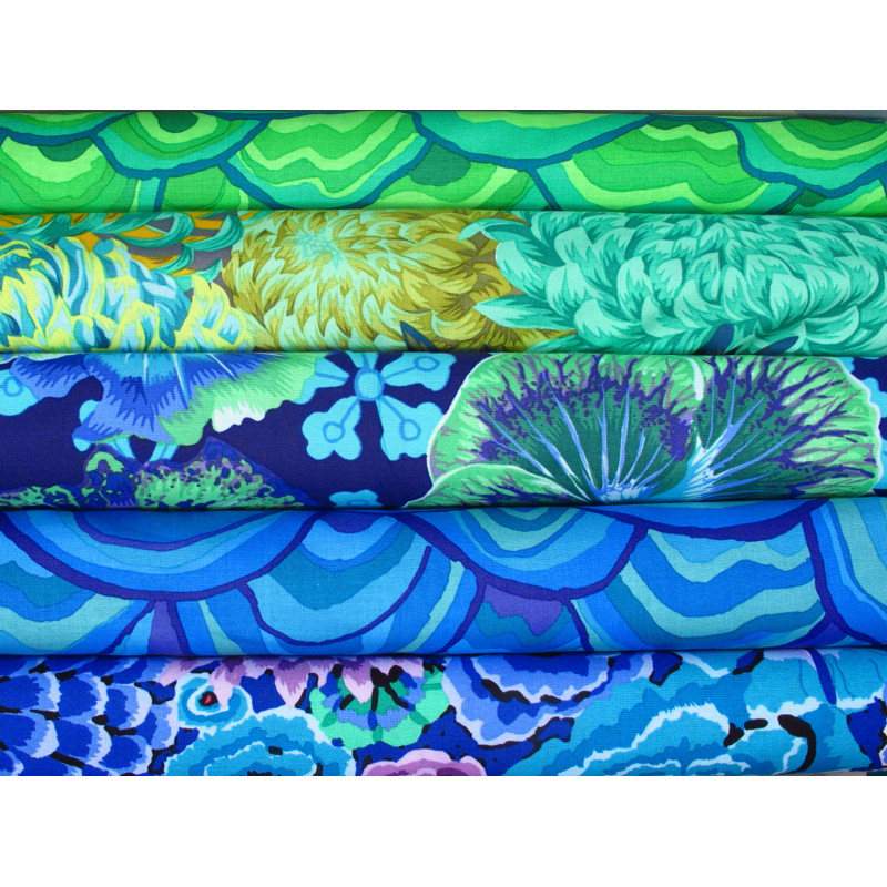 ein herrliches Stoffpaket mit Stoffen von Kaffe Fassett bedruckt mit Blumen und Dots in blau, grün, rosa - perfekt aufeinander abgestimmt -