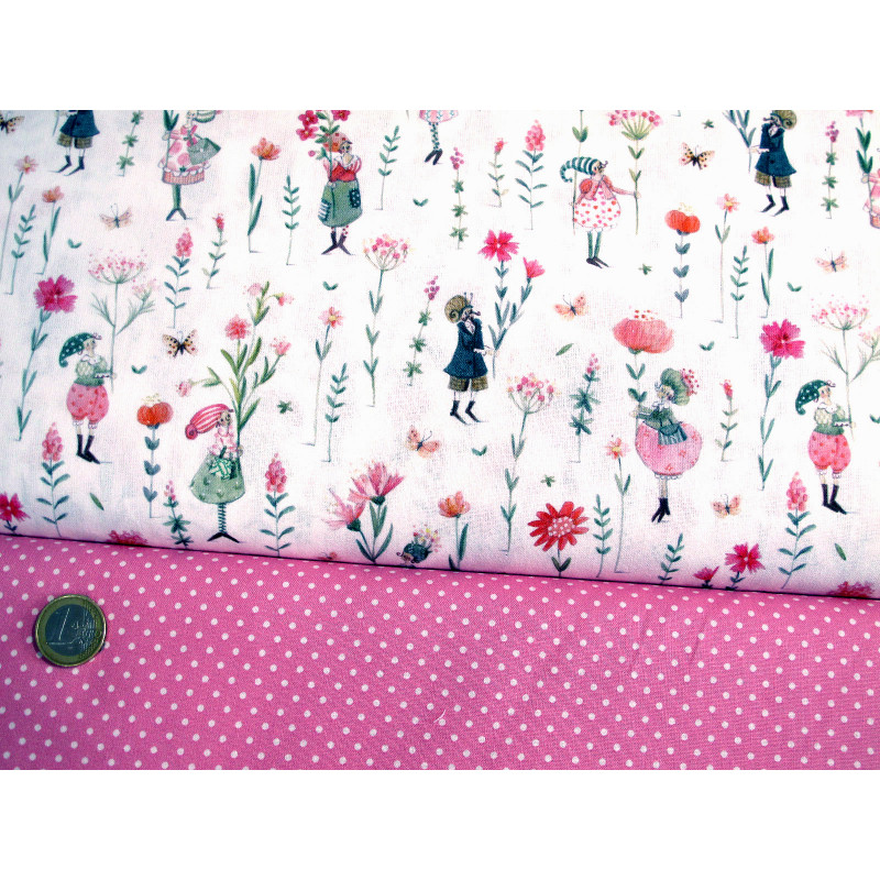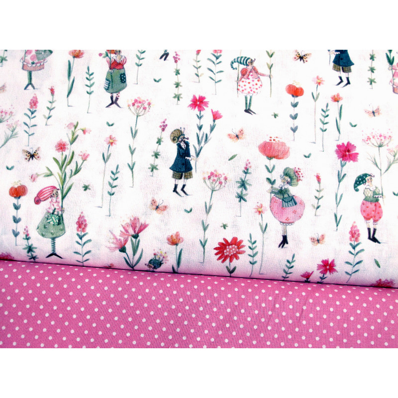 ein tolles Stoffpaket mit 2 Stoffen bedruckt mit Blumen Mädchen Schmetterlingen und Pünktchen in rosa grün und weiß - perfekt aufeinander abgestimmt -