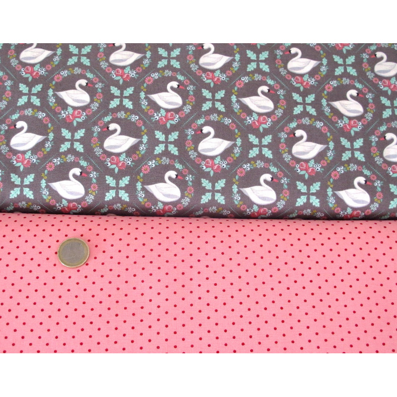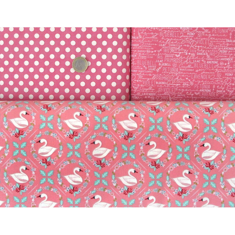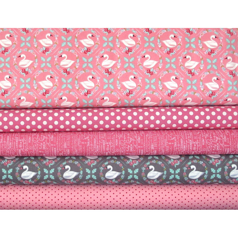 ein Stoffpaket mit 5 wunderschönen Stoffen in rosa pink bedruckt mit Schwänen, Punkten, Schrift, Text, Blümchen - perfekt aufeinander abgestimmt -
