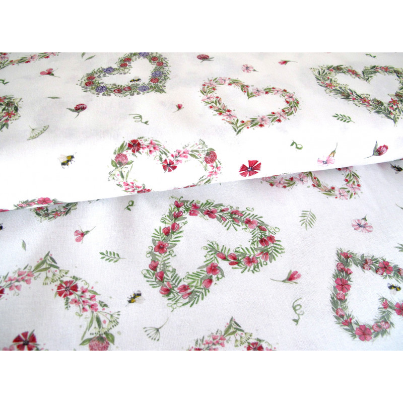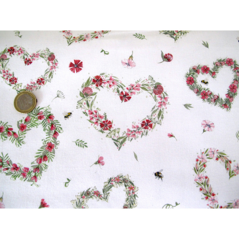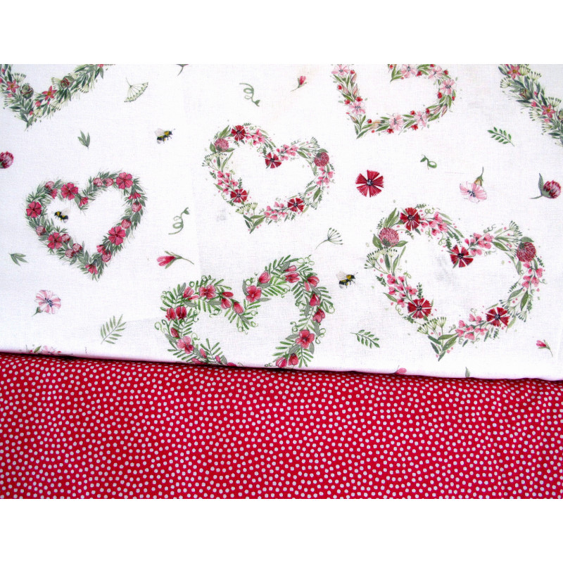 2 hochwertige Baumwollstoffe perfekt aufeinander abgestimmt. Liebevoll und detailreich gezeichnet von Kerstin Heß. Blumenherzen mit Bienen. In Kombination mit einem Pünktchenstoff für vielerlei Nähprojekte geeignet