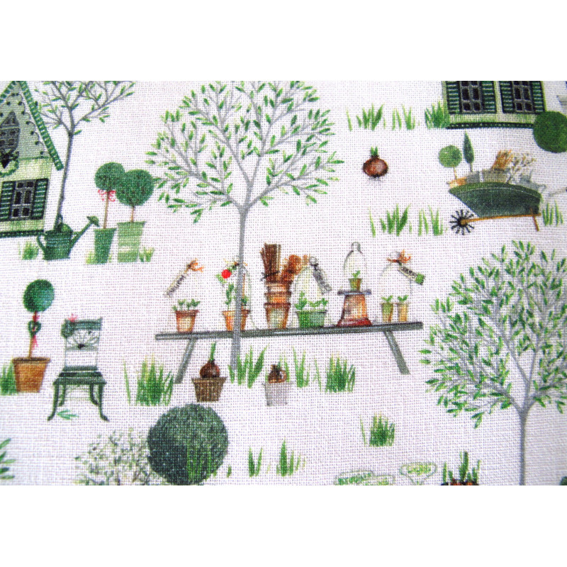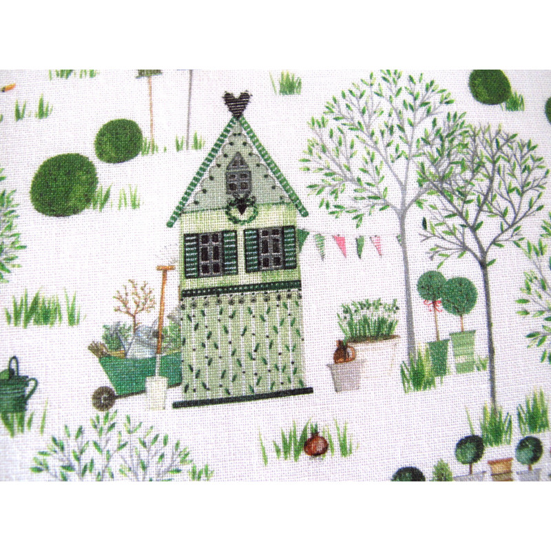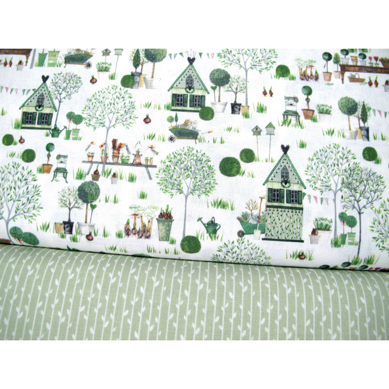 zwei Baumwollstoffe von acufactum für den Frühling von Kerstin Heß bedruckt mit Gartenhäusern, Bäumen, Buchs, Gartendeklo....in grün braun gebrochenem weiß dazu ein Rankenstoff in grün weiß - perfekt aufeinander abgestimmt - beide Stoffe aus einer Serie
