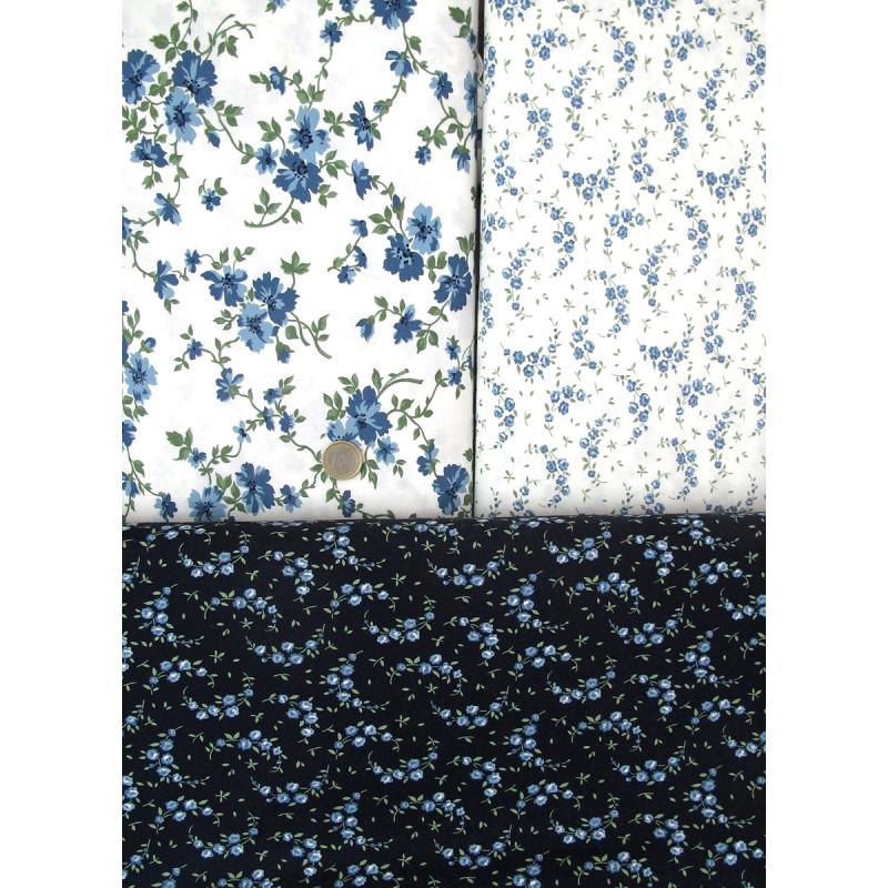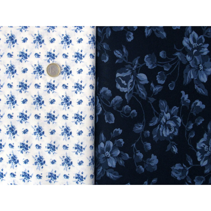 ein Stoffpaket mit 5 wunderschön romantischen Stoffen in blau, grün und weiß bedruckt mit Rosen und Blümchen - perfekt aufeinander abgestimmt -
