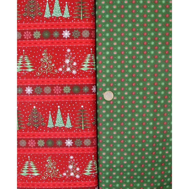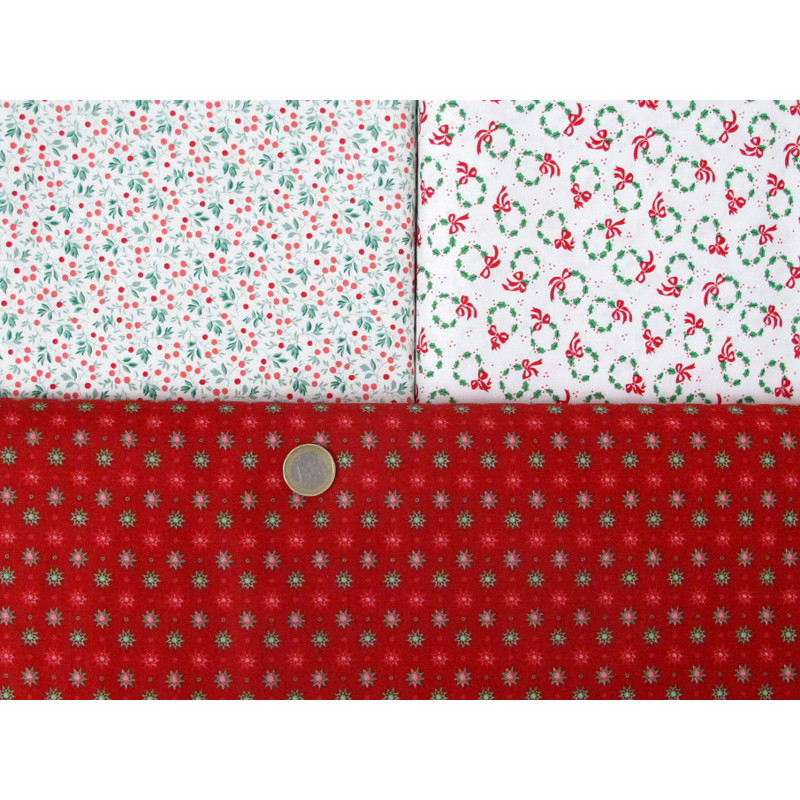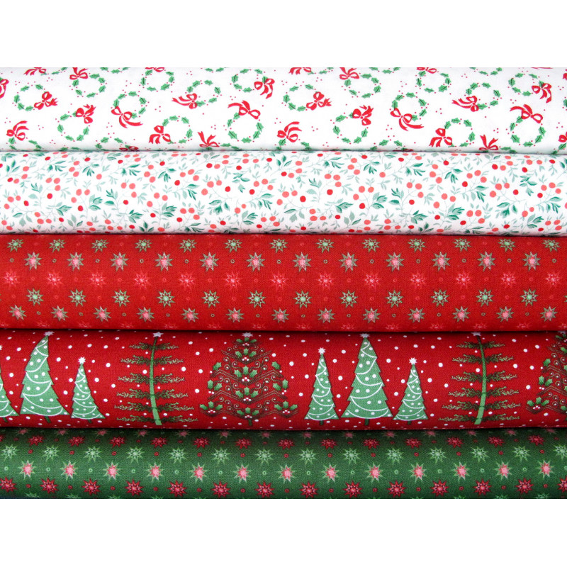 ein Stoffpaket mit 5 wunderschönen weihnachtlichen Stoffen in grün rot bedruckt mit Sternen/ Eiskristallen, Tannen, Beeren, Ilex...- perfekt aufeinander abgestimmt -