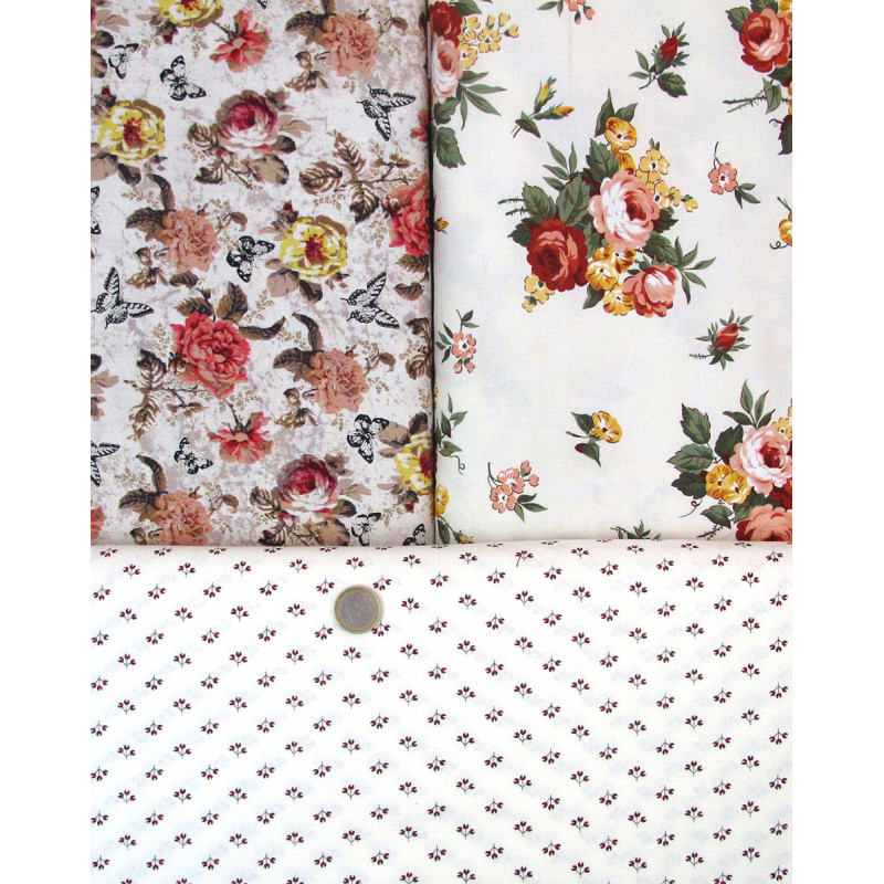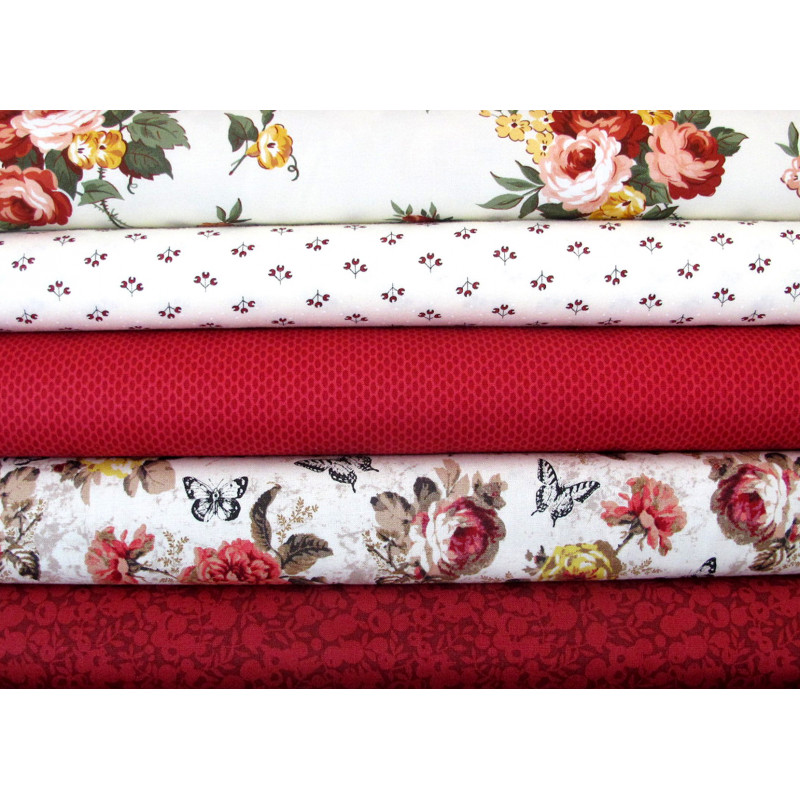ein Stoffpaket mit 5 wunderschönen Stoffen in rot und creme bedruckt mit Beeren, Blumen, Rosen, Schmetterlingen... - perfekt aufeinander abgestimmt -