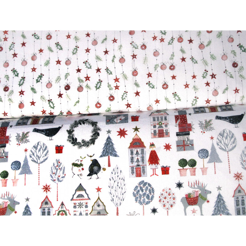 2 hochwertige Baumwollstoffe perfekt aufeinander abgestimmt. Weihnachtliche Motive im Schwedenlook und Girlanden mit Kugeln, Sternchen und Zweigen. Liebevoll und detailreich gezeichnet von Kerstin Heß. Für vielerlei weihnachtliche Nähprojekte geeignet - beide Stoffe zertifiziert nach ÖkoTex Standard 100 und in Europa hergestellt