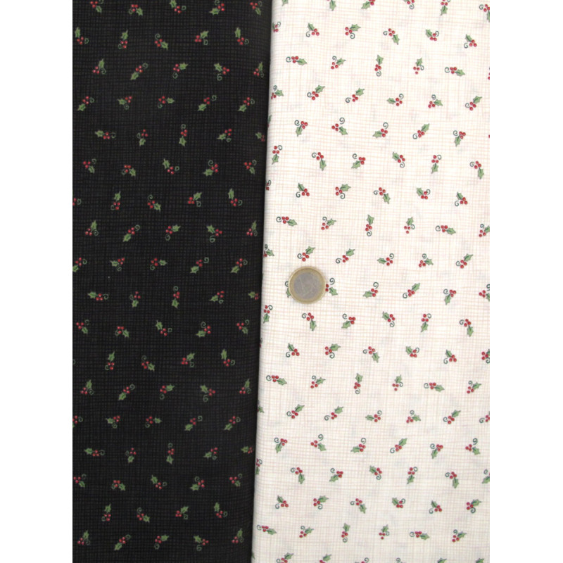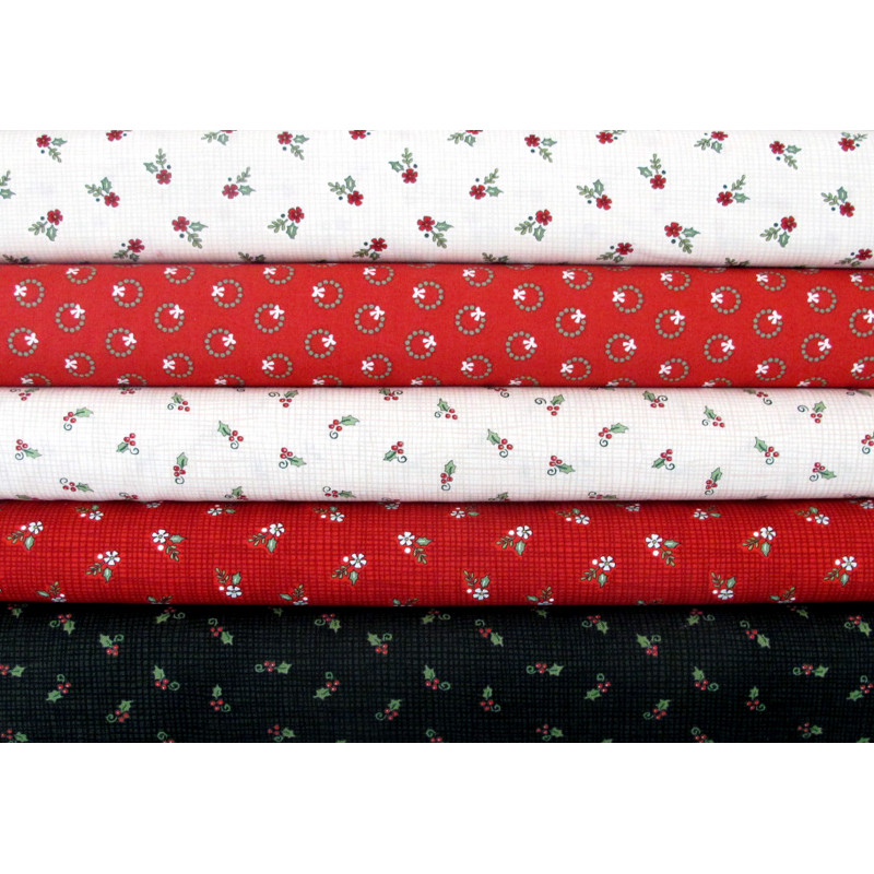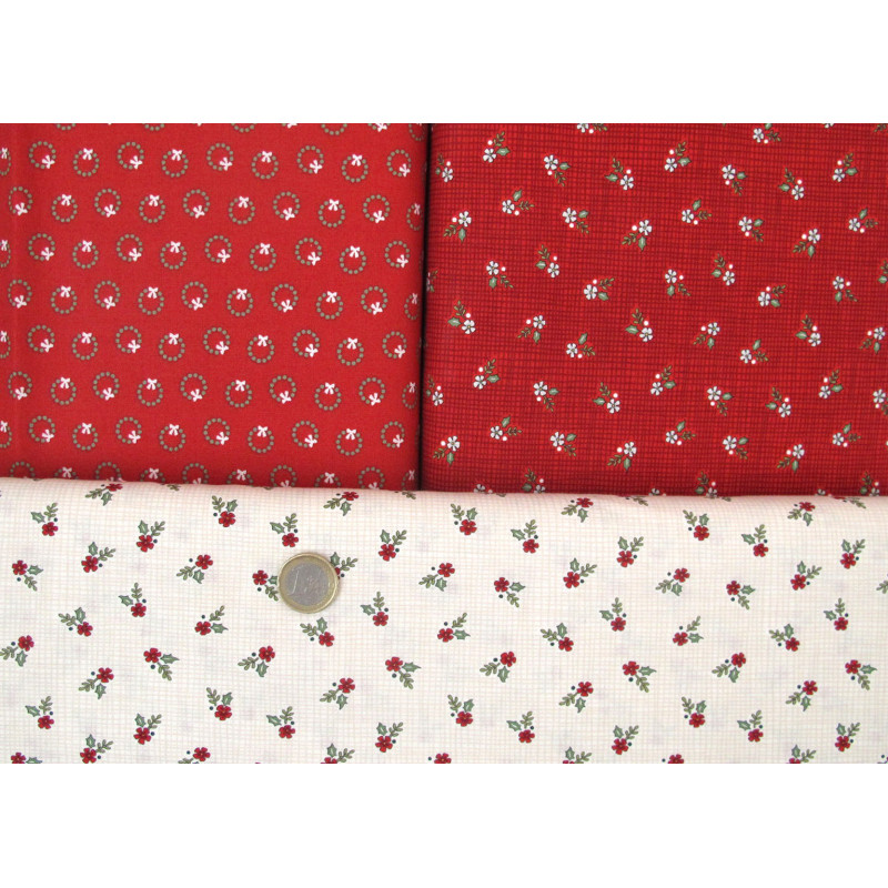 ein Stoffpaket mit 5 wunderschönen weihnachtlichen Stoffen in rot creme schwarz bedruckt mit Ilex und Blümchen - perfekt aufeinander abgestimmt -