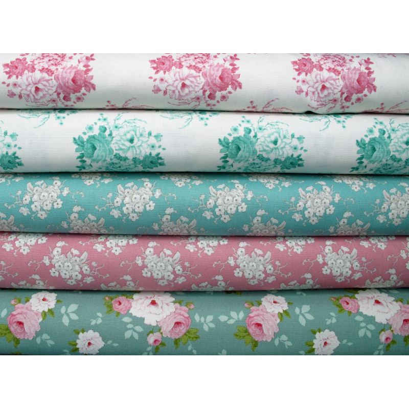 ein Stoffpaket mit 5 wunderschönen Tilda Stoffen bedruckt mit Rosen und Blumen in rosa pink türkis grün mint creme - alles Stoffe aus der Serie Sunday Brunch - perfekt aufeinander abgestimmt -