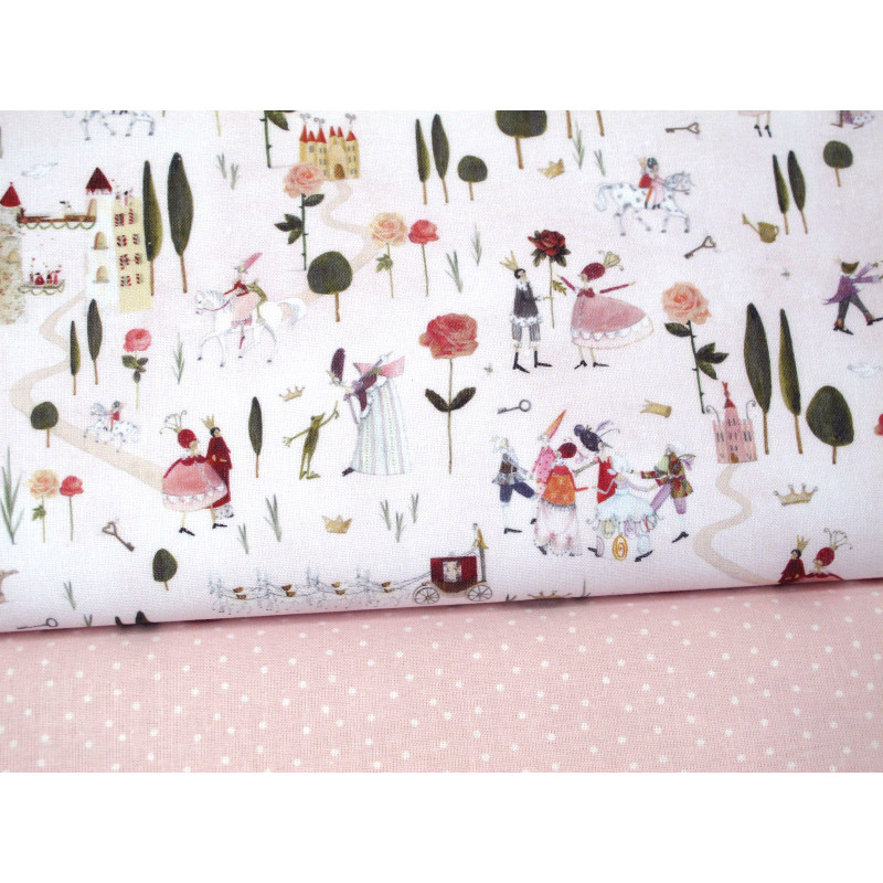 klassische Motive aus der Prinzessin auf der Erbse, dem Froschkönig und weiteren Figuren in verträumter Parklandschaft mit Rosen, Pferdekutschen und imposanten Schlössern auf blassrosa Grund sowie Pünktchen. Liebevoll und detailreich gezeichnet von Silke Leffler für vielerlei Nähprojekte geeignet. 2 hochwertige Baumwollstoffe perfekt aufeinander abgestimmt. Beide von acufactum
