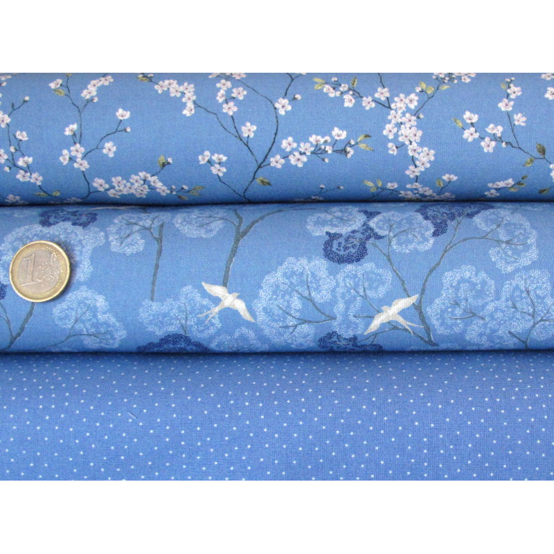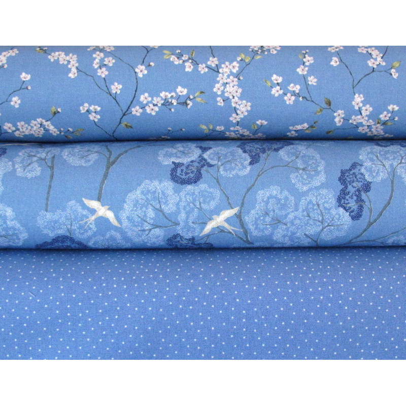 wunderschöne Stoffe von Westfalenstoffe im Paket bedruckt mit Kirschblüten, Pünktchen, Schwalben in blau aus der Serie Osaka und Capri zertifiziert nach ÖkoTex Standard 100 - perfekt aufeinander abgestimmt -