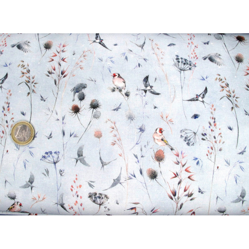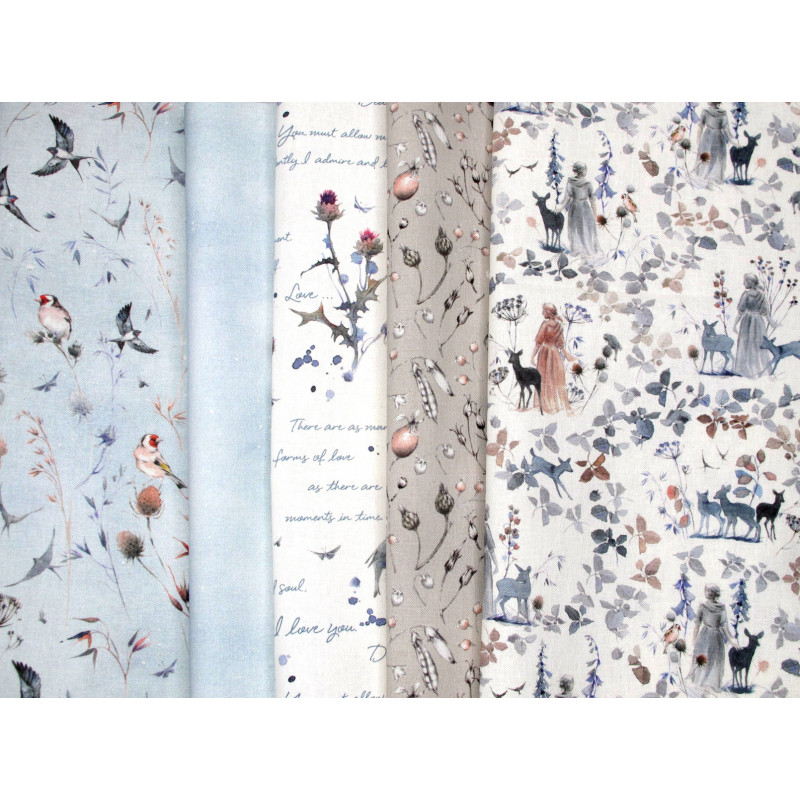ein Stoffpaket mit 5 wunderschönen Stoffen von acufactum zum Buch My Dear Jane in blassblau, braun, rauchblau, taupe.... bedruckt mit Vögeln, Rehen, Frauen, Wildblumen, Gräsern, Zitaten...... - perfekt aufeinander abgestimmt -