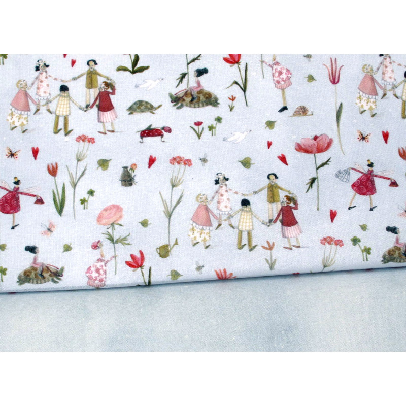 Liebevoll und detailreich gezeichnet von Silke Leffler kleine zarten Wesen Blumen, Rosen, Tiere dazu ein dezent marmorierter blassblauer Stoff. Für vielerlei Nähprojekte geeignet. 2 hochwertige Baumwollstoffe perfekt aufeinander abgestimmt. Beide von acufactum zertifiziert nach ÖkoTex Standard 100 und in Europa hergestellt