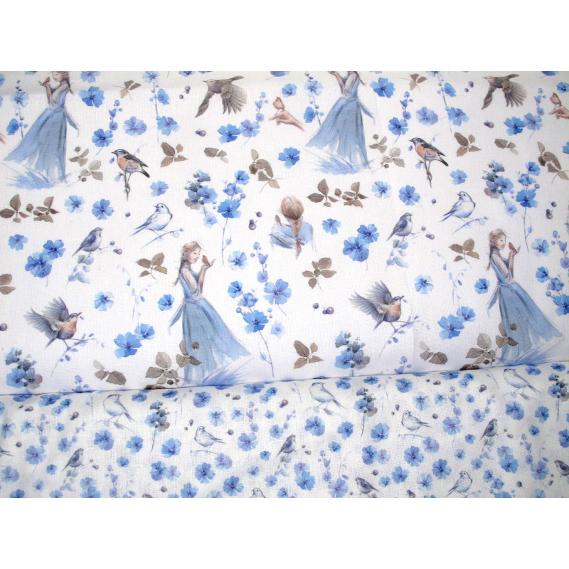 2 hochwertige Baumwollstoffe perfekt aufeinander abgestimmt. Liebevoll und detailreich gezeichnet von Sophia Drescher. Auf einer blühenden Blumenwiese, umrahmt von fliegenden Vögeln, dreht sich eine junge Frau im Wind und hält einen kleinen Vogel auf der Hand - beide Stoffe von acufactum - zertifiziert nach ÖkoTex Standard 100 und in Europa hergestellt