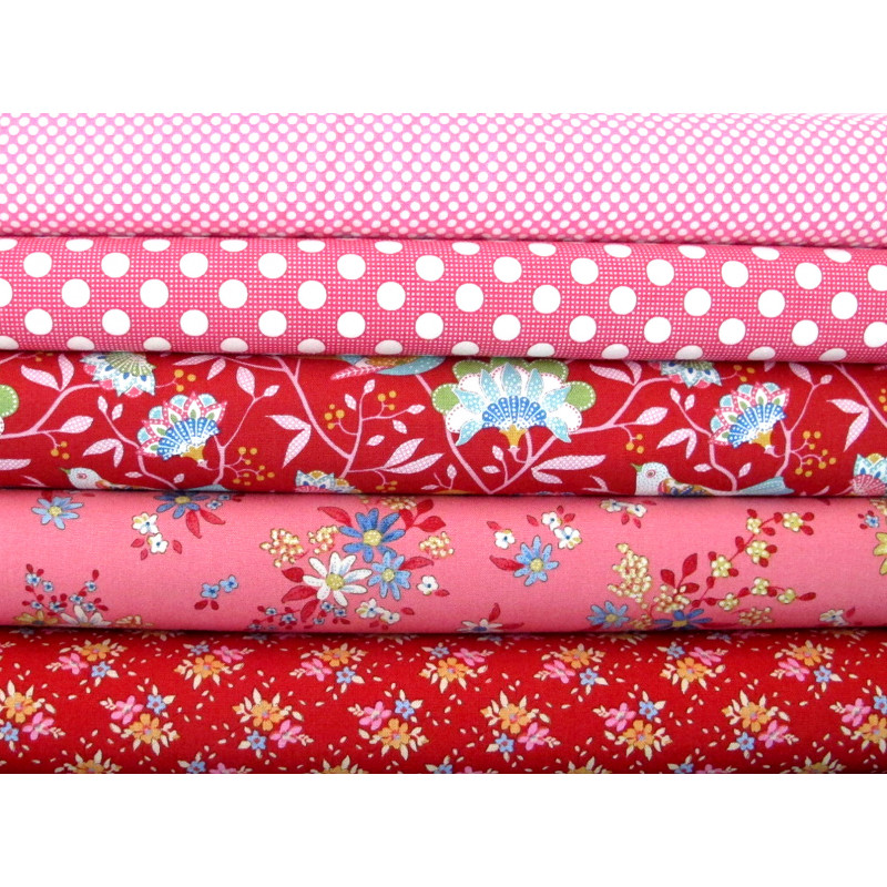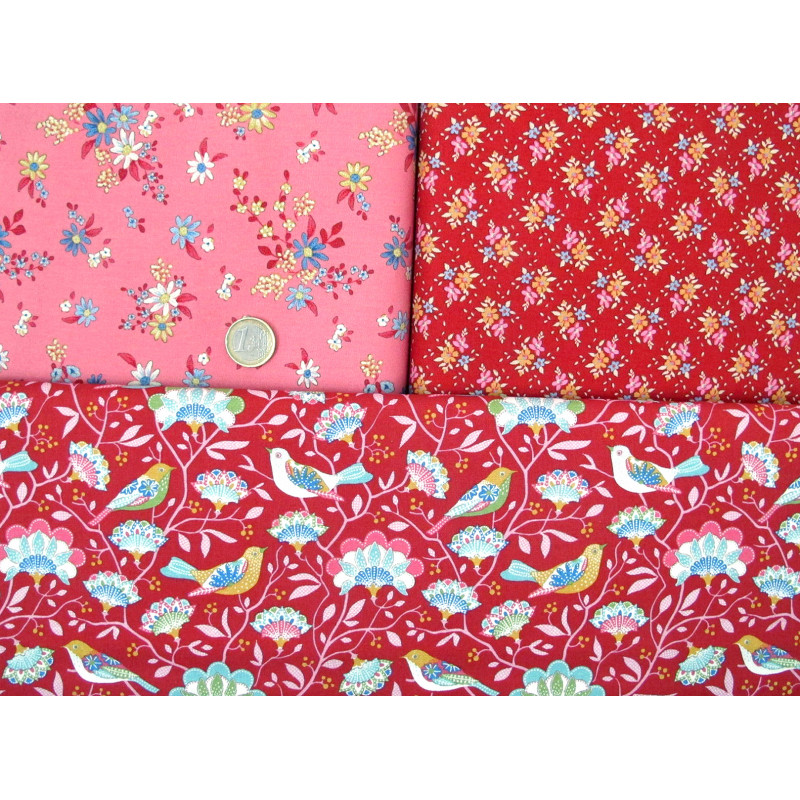 ein Stoffpaket mit 5 herrlichen Stoffen von Tilda in rot rosa bedruckt mit Blumen, Pünktchen, Vögeln - perfekt aufeinander abgestimmt -