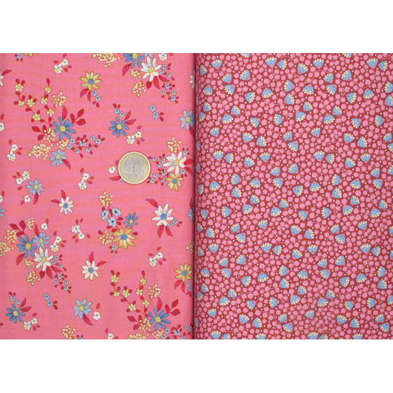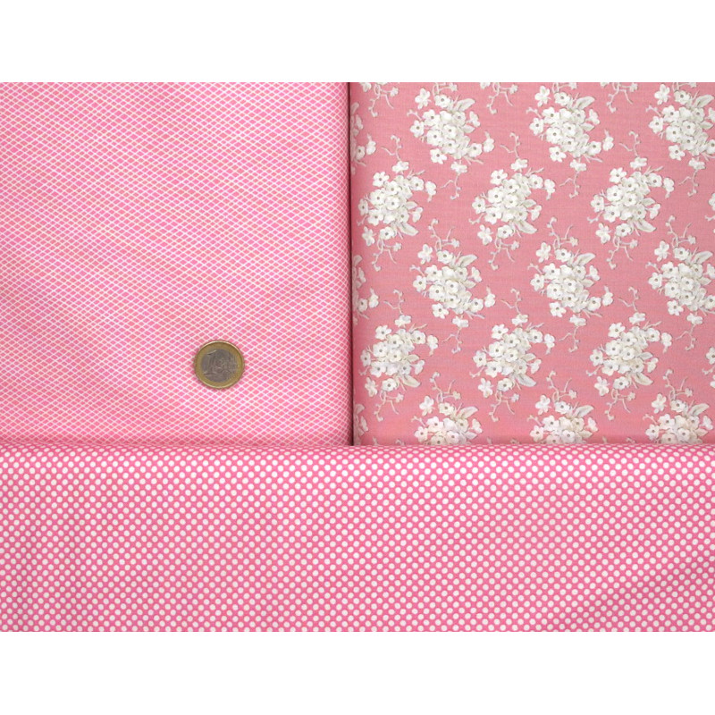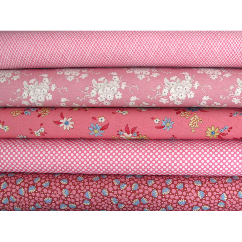 ein Stoffpaket mit 5 herrlichen Stoffen von Tilda in rosa/ pink mit blau und creme bedruckt mit Blumen, Pünktchen, Rauten - perfekt aufeinander abgestimmt -
