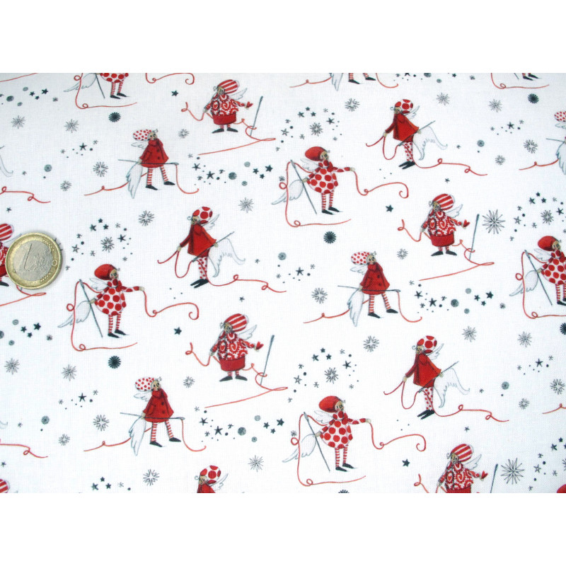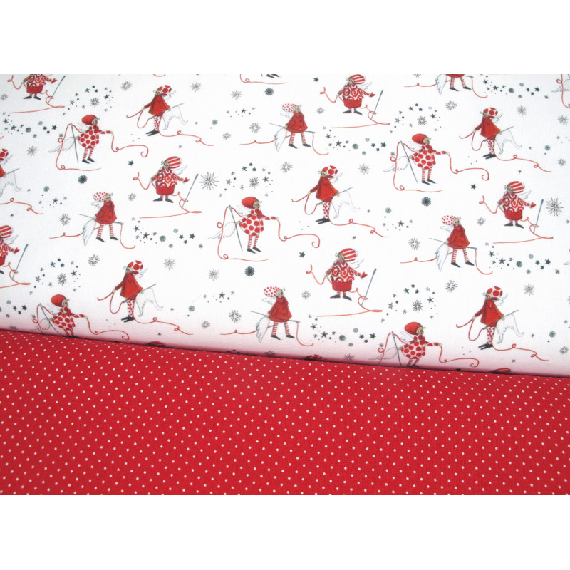 2 hochwertige Baumwollstoffe perfekt aufeinander abgestimmt. Kleine niedliche Engel mit Nadel und Faden zwichen Sternchen auf weißem Grund von Silke Leffler für acufactum. In Kombination mit einem roten Pünktchenstoff von Westfalenstoffe für vielerlei Nähprojekte geeignet. Beide Stoffe zertifiziert nach ÖkoTex Standard 100 und in Europa hergestellt