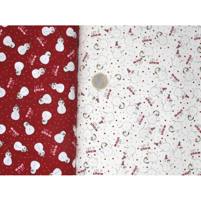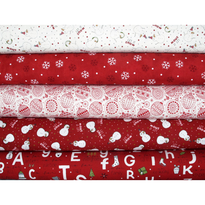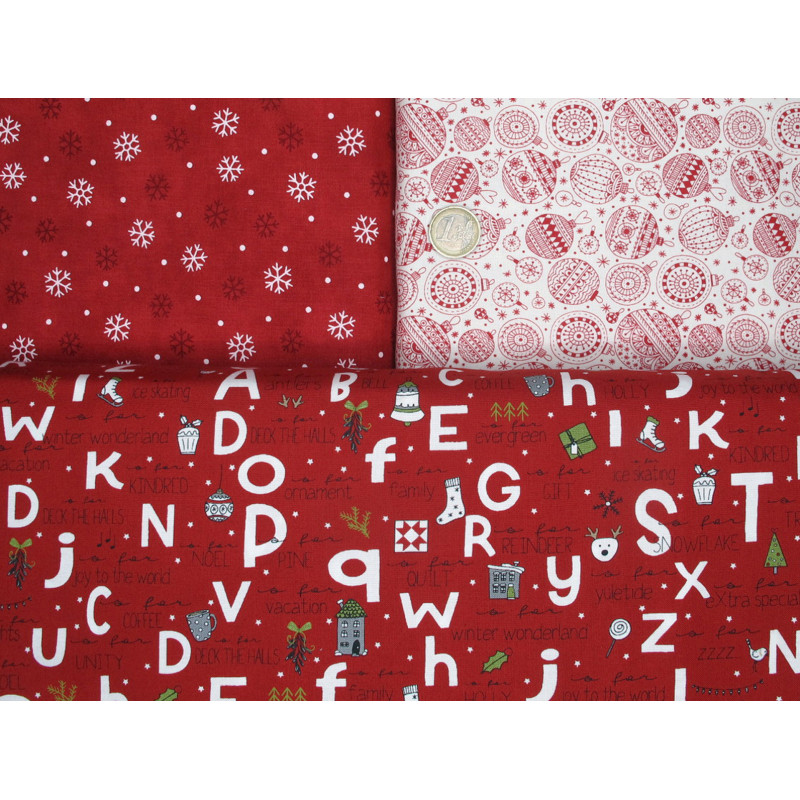 ein Stoffpaket mit 5 wunderschönen weihnachtlichen Stoffen in rot und weiß bedruckt mit Sternen/ Eiskristallen, Schneemann, Buchstaben...- perfekt aufeinander abgestimmt -