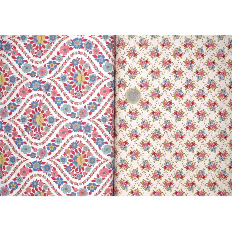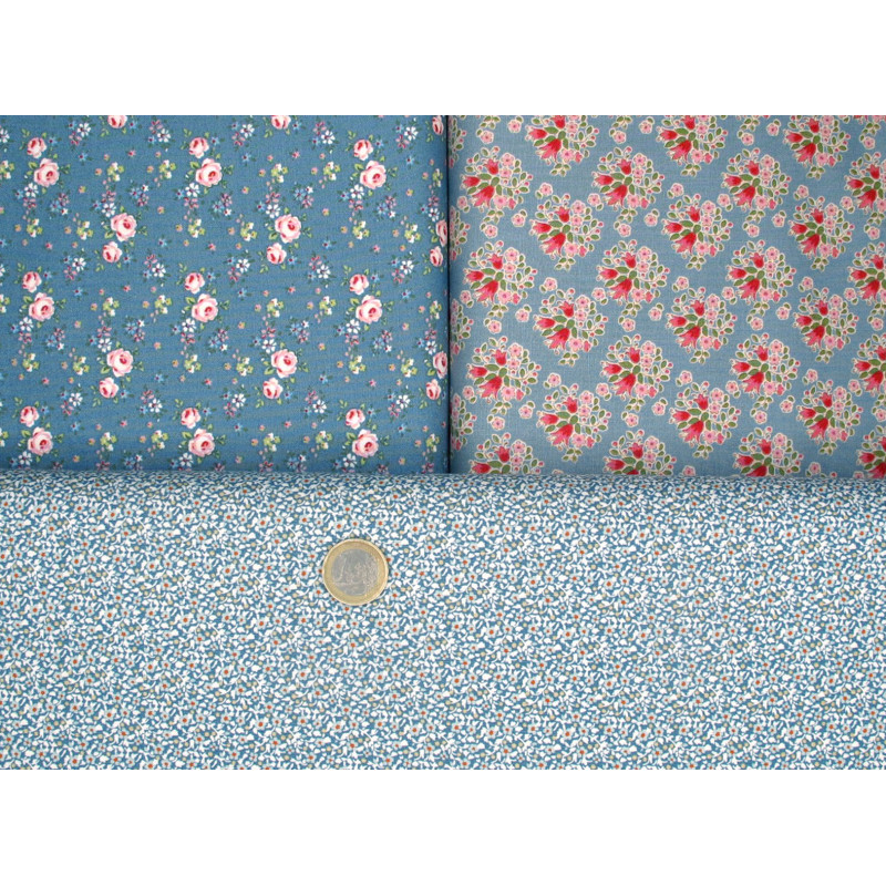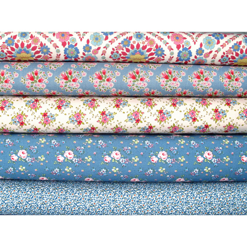 ein Stoffpaket mit 5 herrlichen Stoffen von Tilda in blau, creme, rot rosa bedruckt mit Blumen und Rosen - perfekt aufeinander abgestimmt -