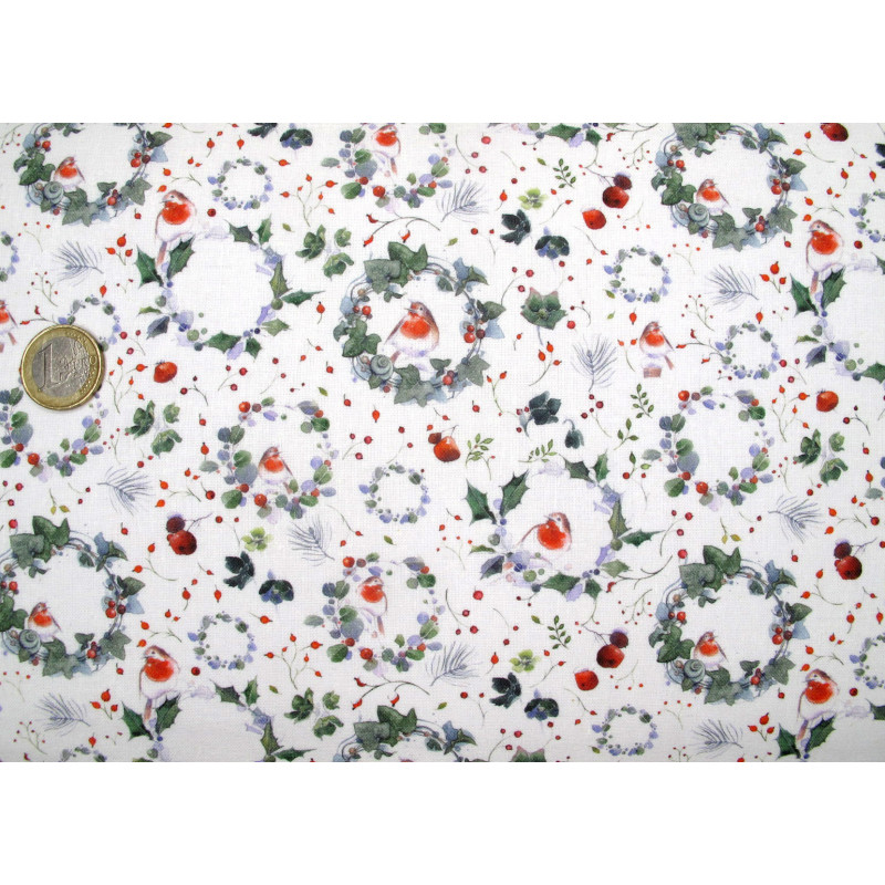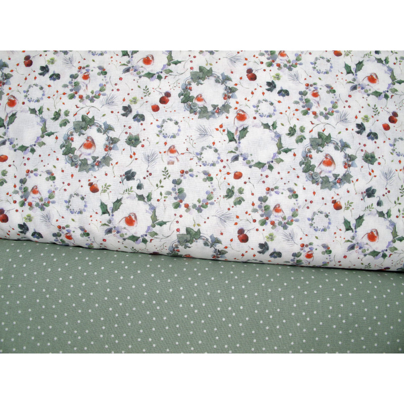 2 hochwertige Baumwollstoffe perfekt aufeinander abgestimmt. Kleine Rotkehlchen im Efeukranz/ Ilexkranz dazu Pünktchen in salbei. Liebevoll und detailreich gezeichnet von Sophia Drescher. Bei Stoffe von acufactum für vielerlei weihnachtliche Nähprojekte geeignet