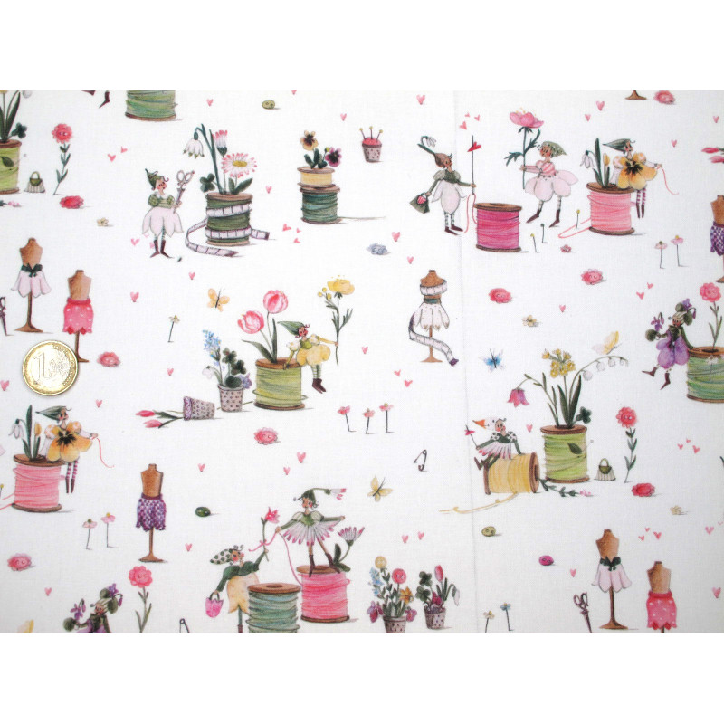 zwei Baumwollstoffe von acufactum für den Frühling von Silke Leffler bedruckt mit kleinen Frühlingselfen mit Blumen und Nähutensilien dazu ein Pünktchenstoff - perfekt aufeinander abgestimmt - beide Stoffe von acufactum - zertifiziert nach ÖkoTex Standard 100 und in Europa hergestellt