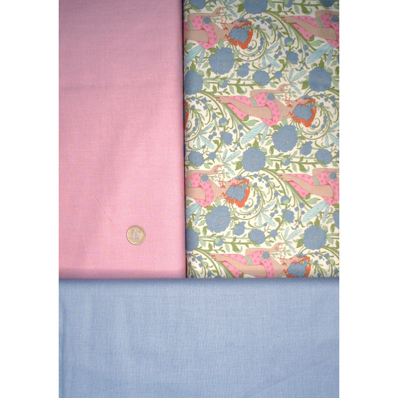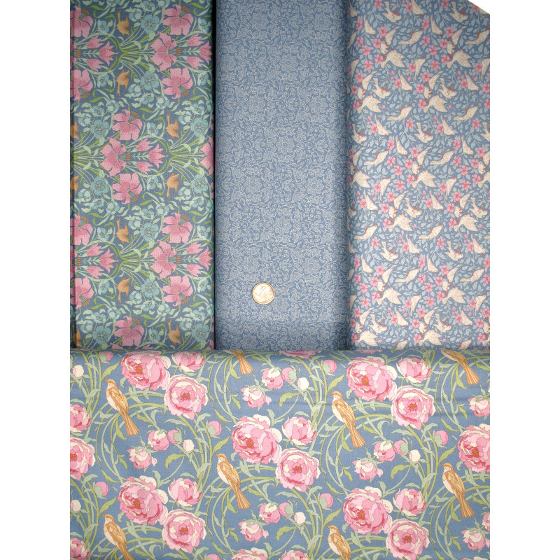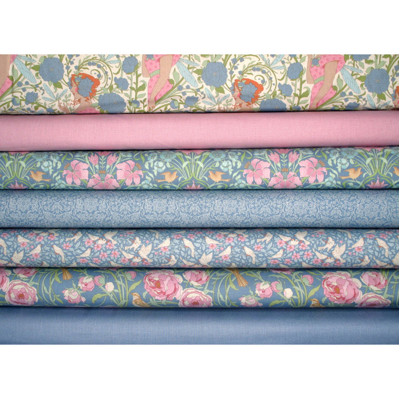 ein wunderschönes Stoffpaket mit Tildastoffen bedruckt mit Pfingstrosen, Lilien, jungen Frauen, Libellen und winzigen Pünktchen in Art Nouveau Stil - alle Stoffe aus der Serie Songbird und PoppySeed - perfekt aufeinander abgestimmt -