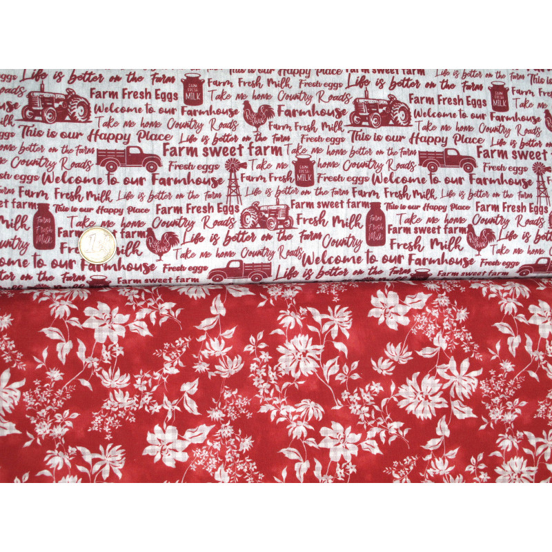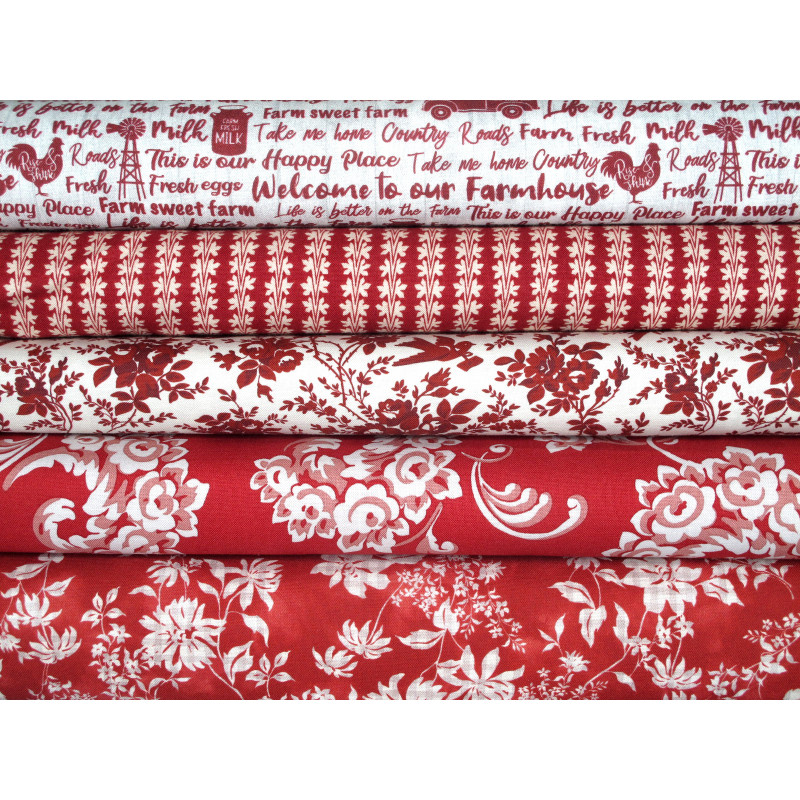 ein Patchwork Stoffpaket mit 5 wunderschönen Stoffen in rot creme bedruckt mit Blumen Text Vögeln - perfekt aufeinander abgestimmt -