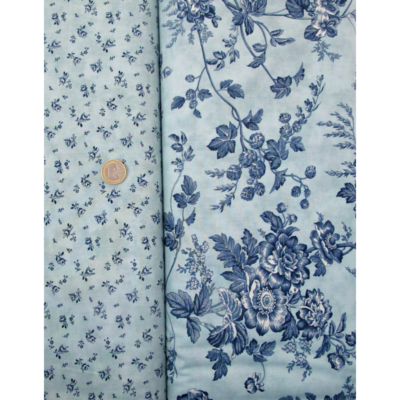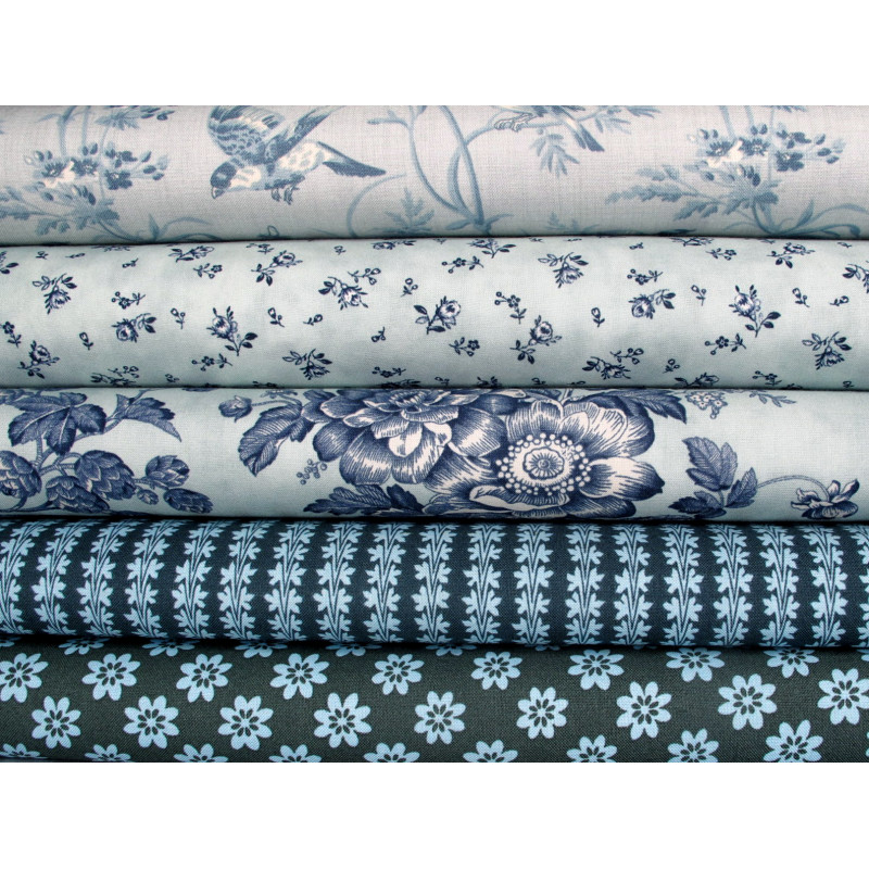 ein Stoffpaket mit 5 Baumwollstoffen bedruckt mit Blumen, Rosen, Vögeln in blau/ türkis - perfekt aufeinander abgestimmt -