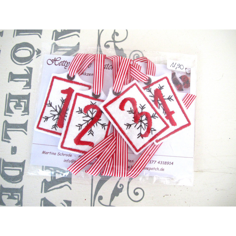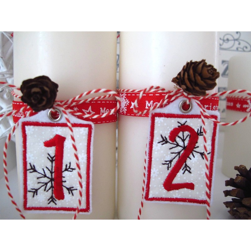 Zahl, Schneeflocke und Rahmen sind auf Filz und Baumwollstoff gestickt und mehrfach verstärkt. Daher sehr formstabil