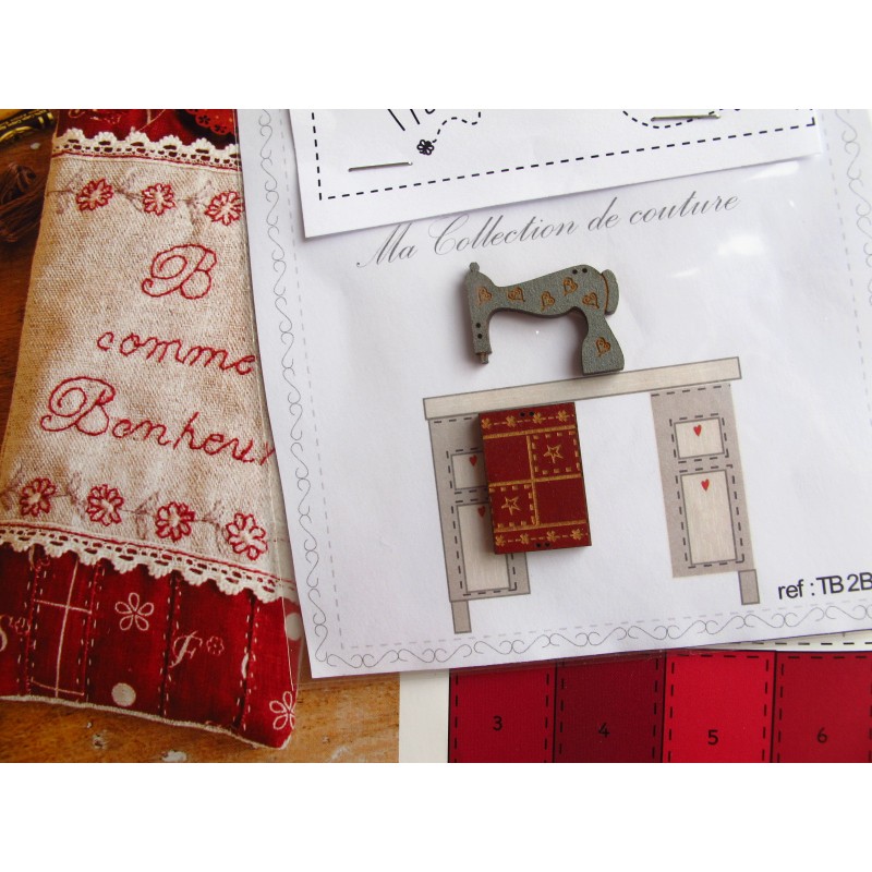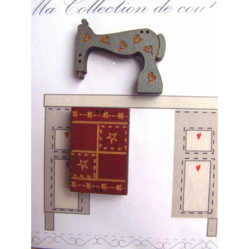 Angeboten wird ein Set mit einem kleinen Quilt (18 x 25 mm) und einer Nähmaschine (25 x 27 mm) von The Bee Company. Alles aus Holz und sehr liebevoll verziert in rauchblau / grau und rot.