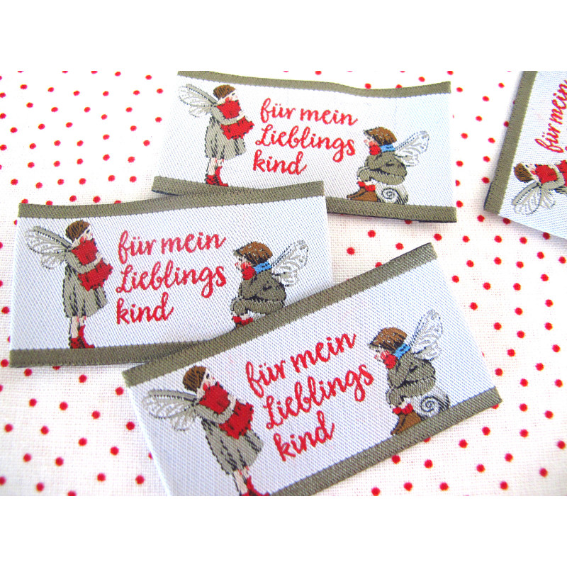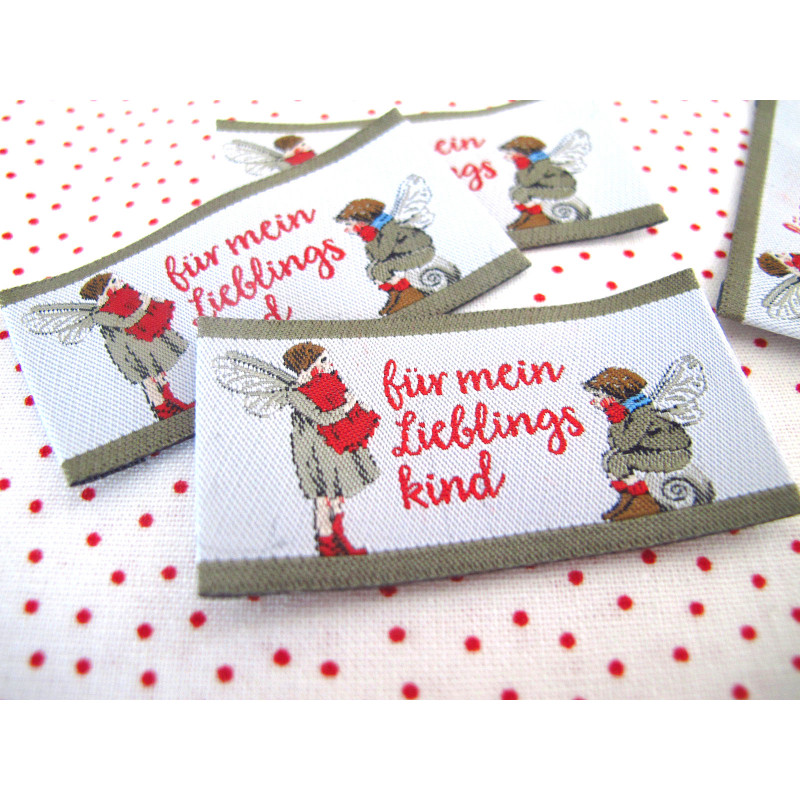 2 Elfen dazwischen der Text "für mein Lieblingskind" auf weißem Grund. Verleihen Sie Ihrer Eigenkreation eine persönliche Note mit diesen Web-Etiketten. Ein schönes Detail für Ihre Näh- oder Handarbeit über das sich das Lieblingskind bestimmt freuen wird.