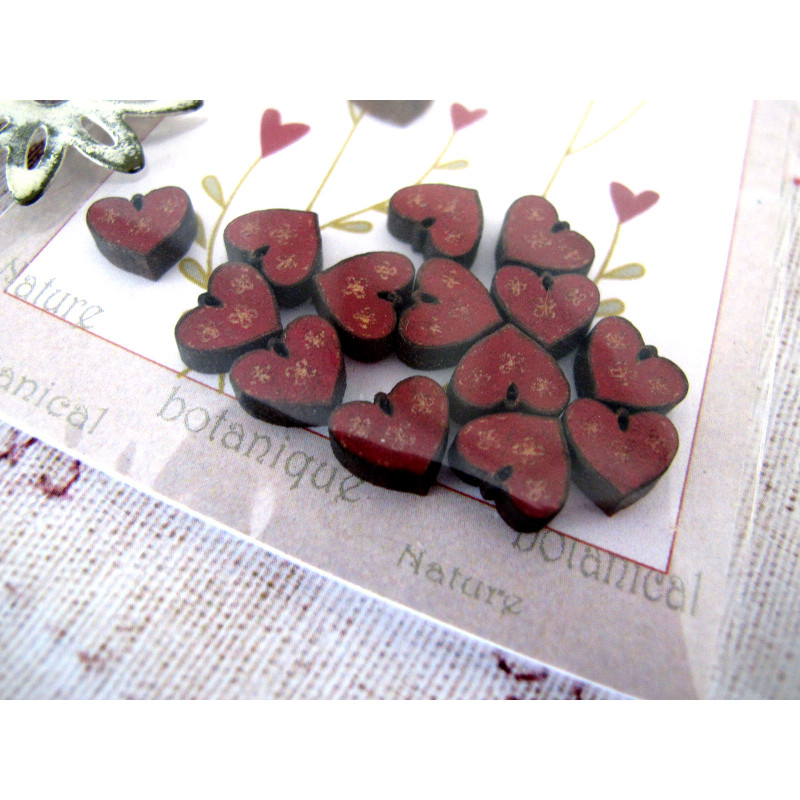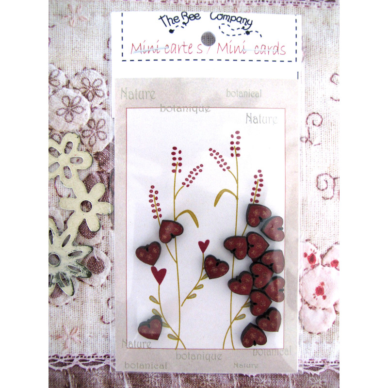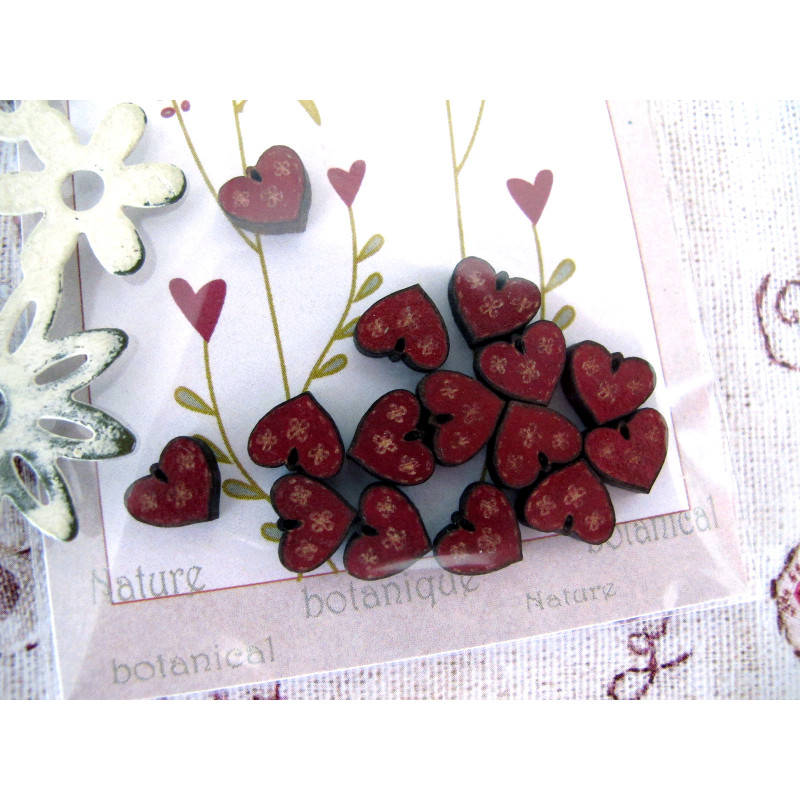Angeboten wird ein Päckchen mit 15 kleinen Herzknöpfen in rot von The Bee Company aus Holz. Die Herzen haben eine Größe von 9 x 9 mm.
