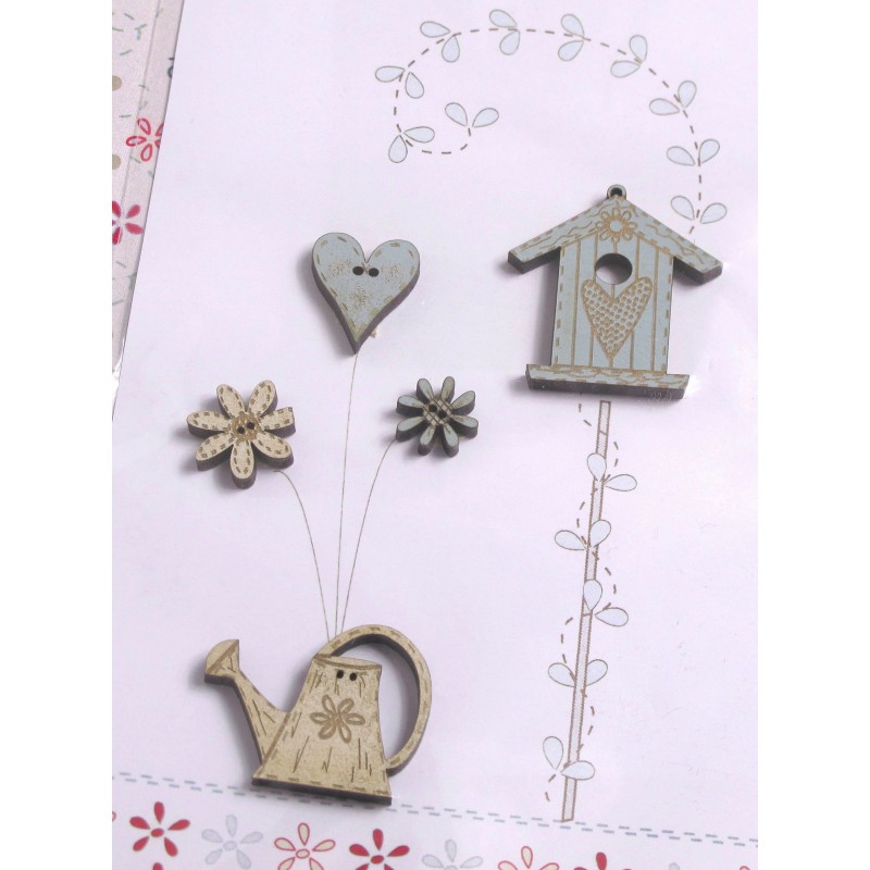 Angeboten wird ein Päckchen mit einem kleinen Vogelhaus, zwei Blumen, einer Gießkanne und einem Herzchen von The Bee Company. Alles aus Holz und sehr liebevoll verziert. Das Vogelhaus hat eine Höhe von 32 mm.