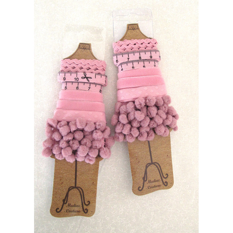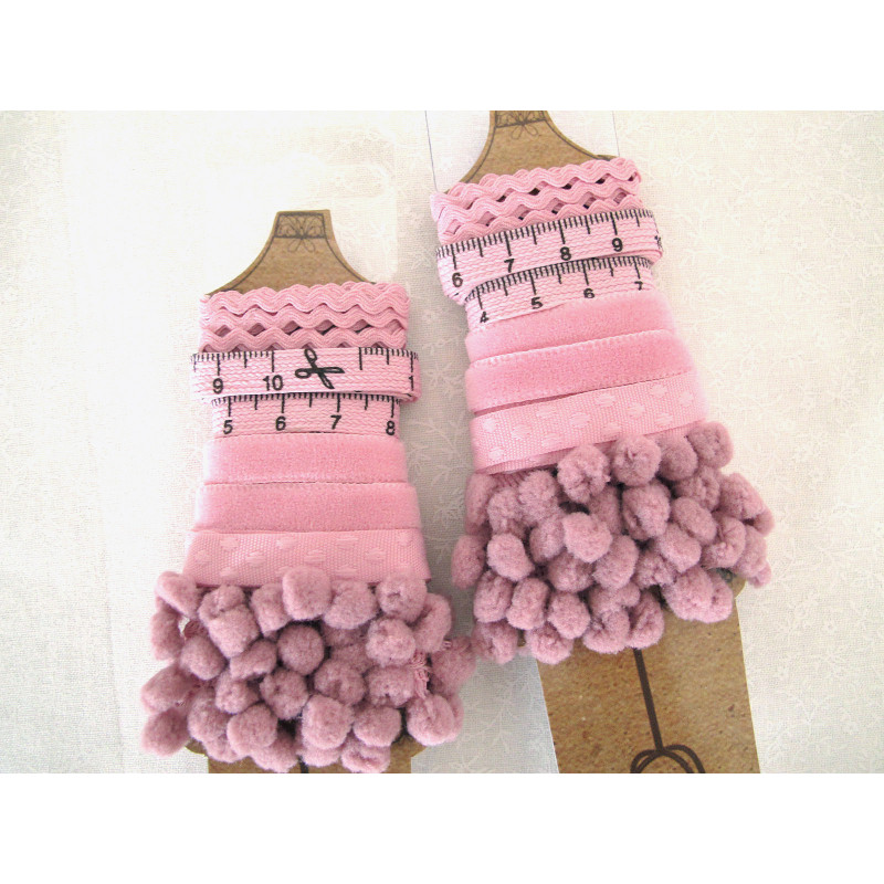 verspielt und äußerst hübsch aufgewickelt. 5 verschiedene Borten auf einer Papp-Schneiderpuppe. Einfach herzallerliebst und bestimmt eine nette Überraschung für einen lieben Menschen.5 Borten in antikrosa jeweils 1 m