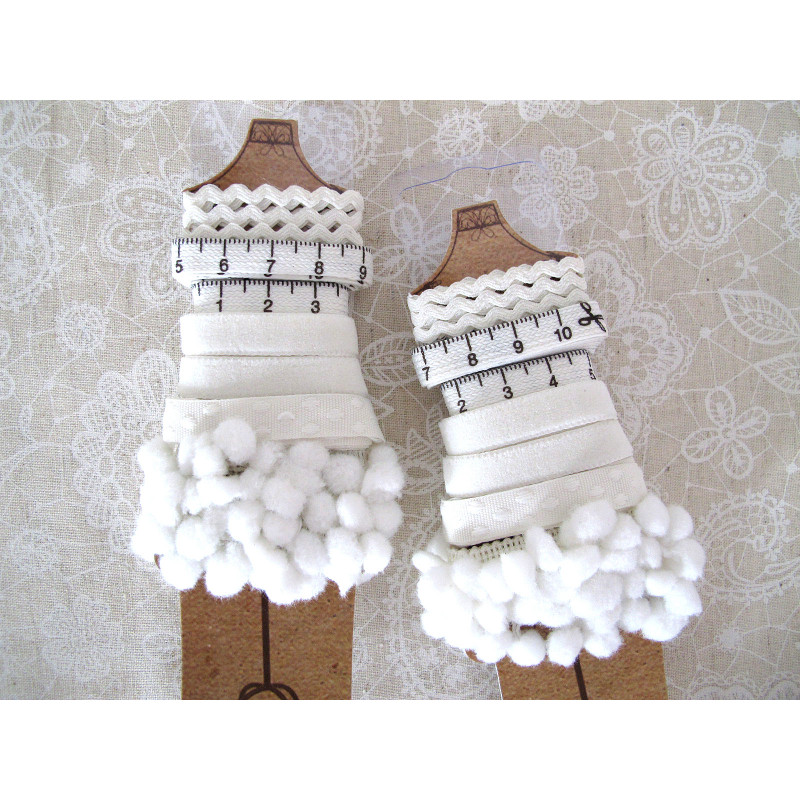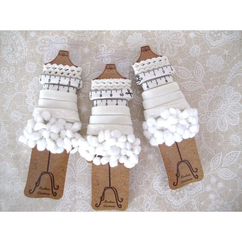 verspielt und äußerst hübsch aufgewickelt. 5 verschiedene Borten auf einer Papp-Schneiderpuppe. Einfach herzallerliebst und bestimmt eine nette Überraschung für einen lieben Menschen.5 Borten in cremeweiß/ elfenbein jeweils 1 m