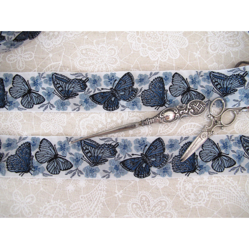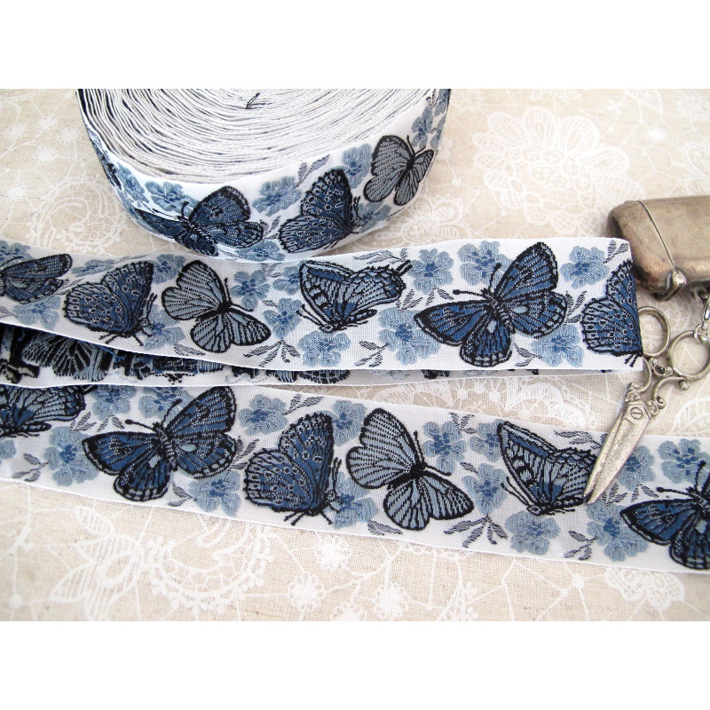 ein wunderschönes hochwertiges Webband aus der Bandweberei Kafka, Wuppertal. Frühlings Schmetterling - Schmetterlinge mit Blumen in blau. Das Webband ist 32 mm breit. 100 % Baumwolle (Schuß) 100 % Polyester (Kette - dadurch strapazierfähiger)