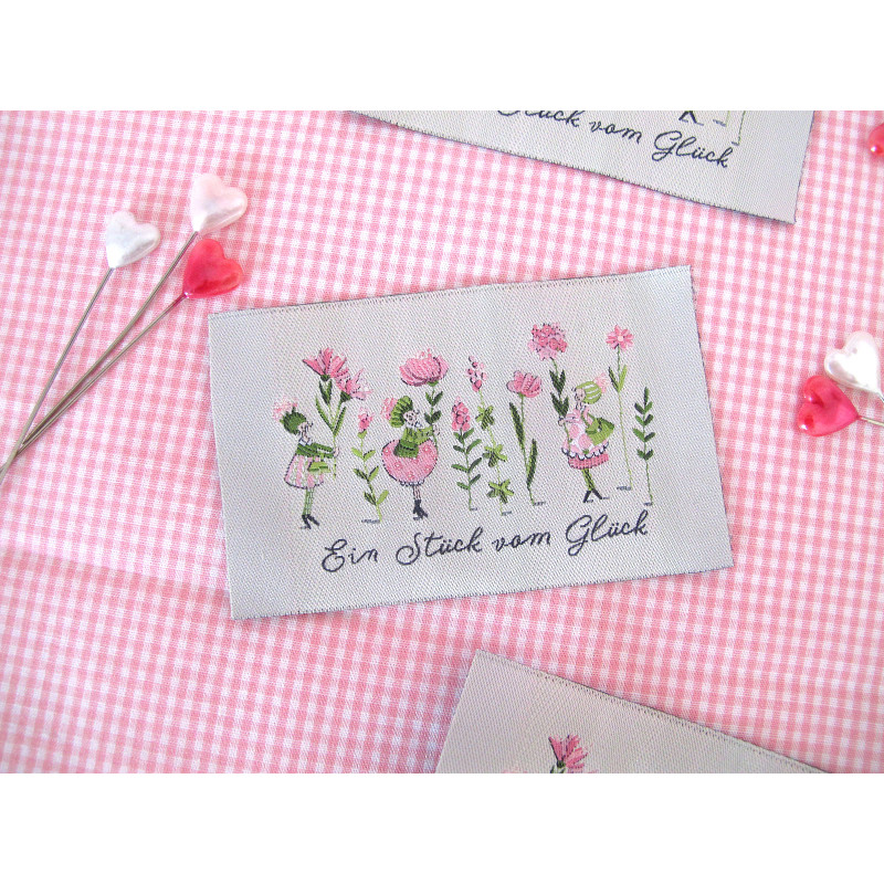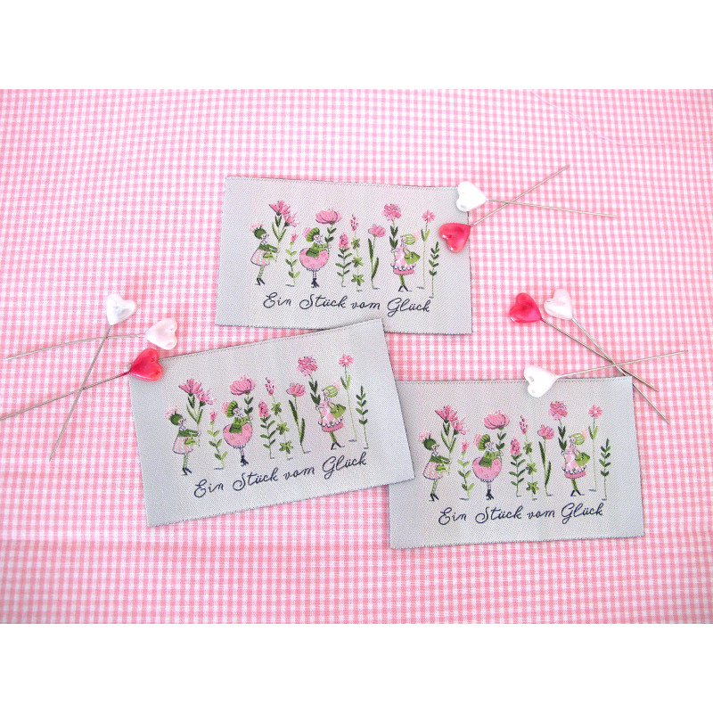 Blumen und Blumenmädchen in rosa und grün mit dem Text "Ein Stück vom Glück" . Richtig hübsch für Kleidung, Accessoires, Geschenkverpackungen, Anhänger und vieles mehr. Set mit 3 Stück 100 % Polyester ohne Endfalte nicht heiß bügeln