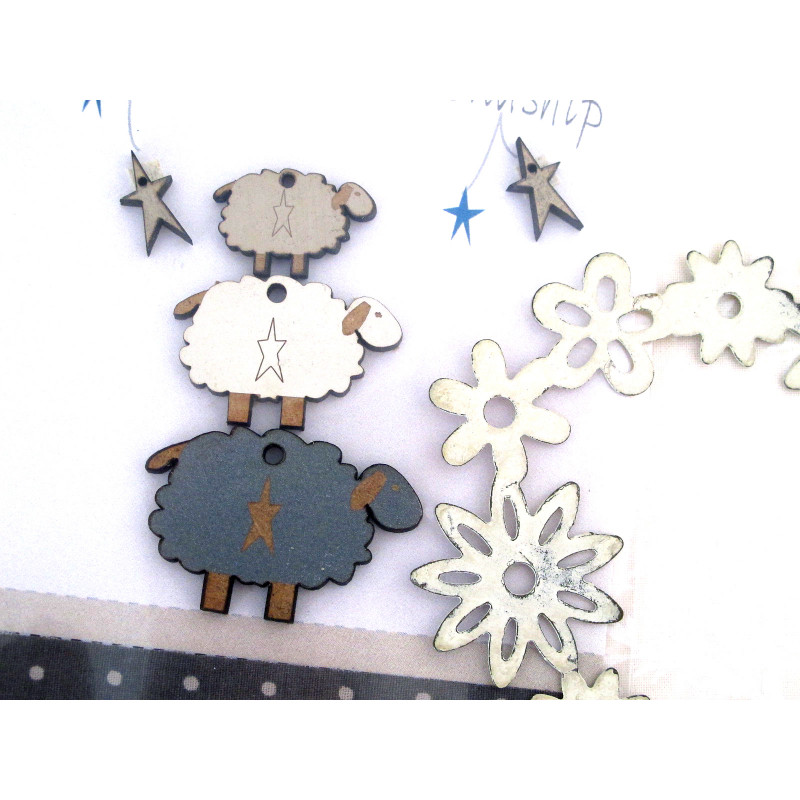 Angeboten wird ein Päckchen mit drei Schafen und 2 Sternchen von The Bee Company. Alles aus Holz und sehr liebevoll. Die Schafe sind 20 x 24 mm/ 22 x 32 mm und 25 x 38 mm groß und die Sternchen 10 x 16 mm