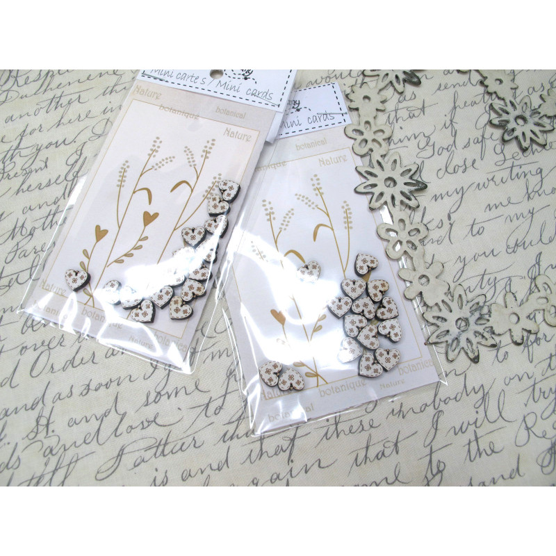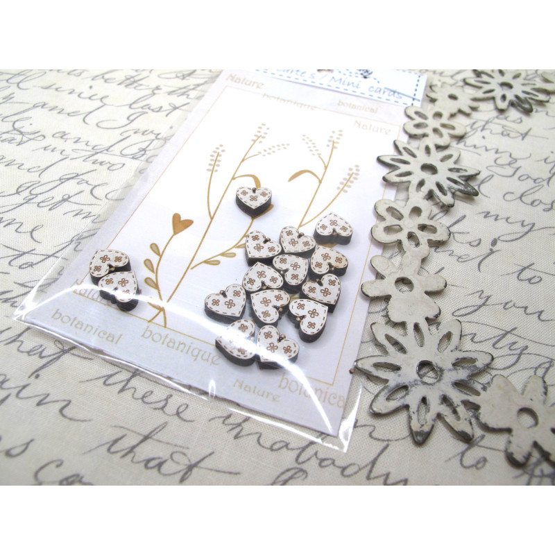 Angeboten wird ein Päckchen mit 15 Mini Herzchen in creme mit hellbeige von The Bee Company. Alles aus Holz und sehr liebevoll verziert. Die Herzchen sind 9 mm.