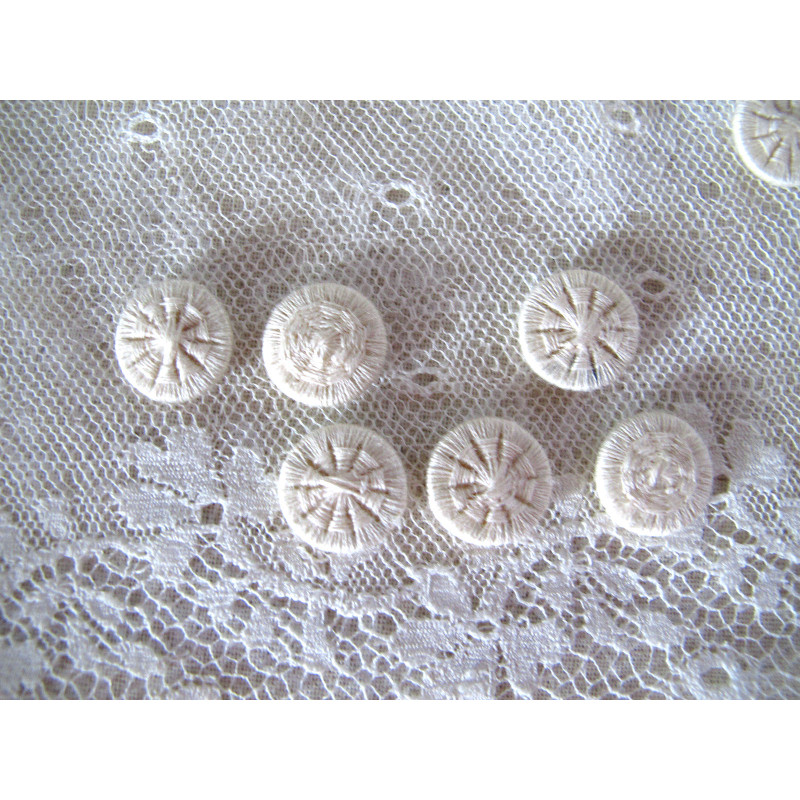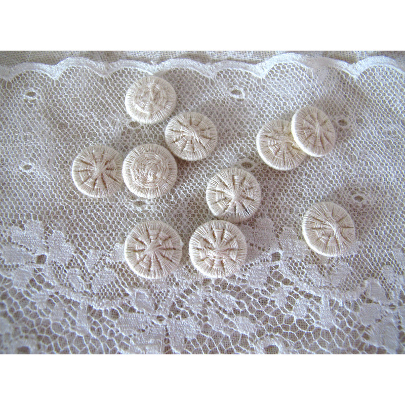 Angeboten werden 5 Stück Zwirnknöpfe Wäscheknöpfe in cremeweiß, Durchmesser 12 mm. Nach alter Tradition gefertigt. Schön dicht gewickelt.