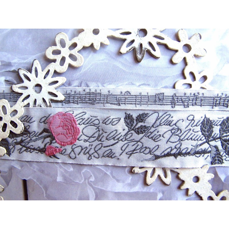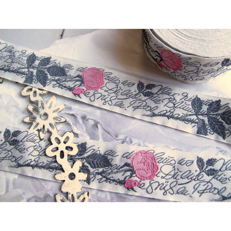 ein sehr edles hochwertiges wunderbar romantisches Webband aus der Bandweberei Kafka, Wuppertal. Eine langstielige Rose in rosa und anthrazit mit Gedicht von Heinrich Heine auf hell grau. Das Webband ist 25 mm breit. 100 % Baumwolle (Schuß) 100 % Polyester (Kette - dadurch strapazierfähiger)