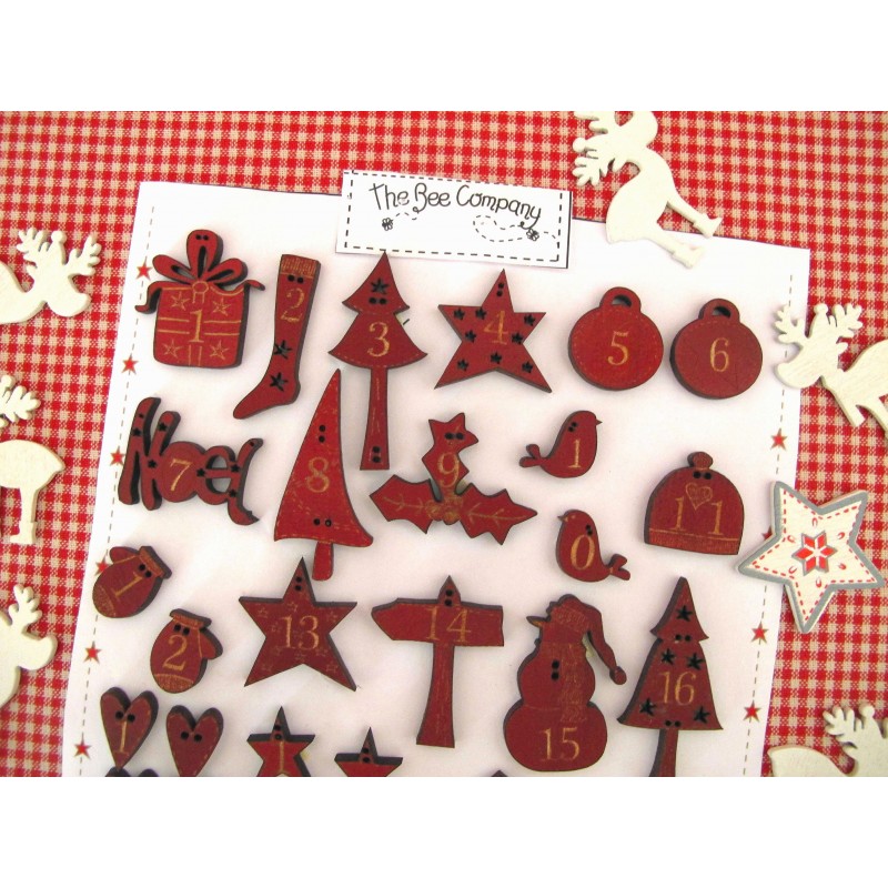 Die Adventskalenderzahlen sind unterschiedlich groß. Der Schneemann ist z.B. 38 mm hoch. Das Herz Nr. 21 hat eine Höhe von 30 mm. Zusätzlich enthalten sind zwei kleine Herzchen- und Sternchenknöpfe. Von Bee Company, ganz liebevoll verziert.
